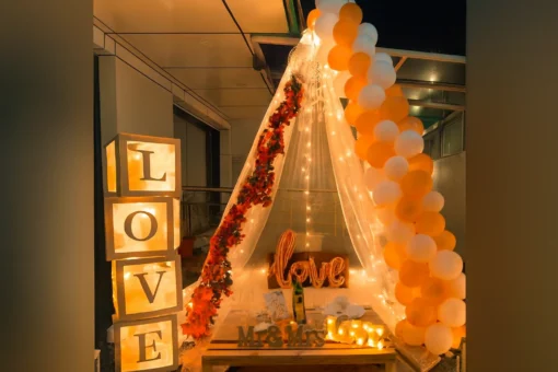 ✅ “LOVE” boxes filled with rosegold metallic and white balloons and one LED light.