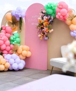 ✅ Arch of two hundred balloons of color fifty pastel green, fifty pastel orange, fifty pastel purple, and fifty pastel pink balloons decorated with ten flower bunches.
