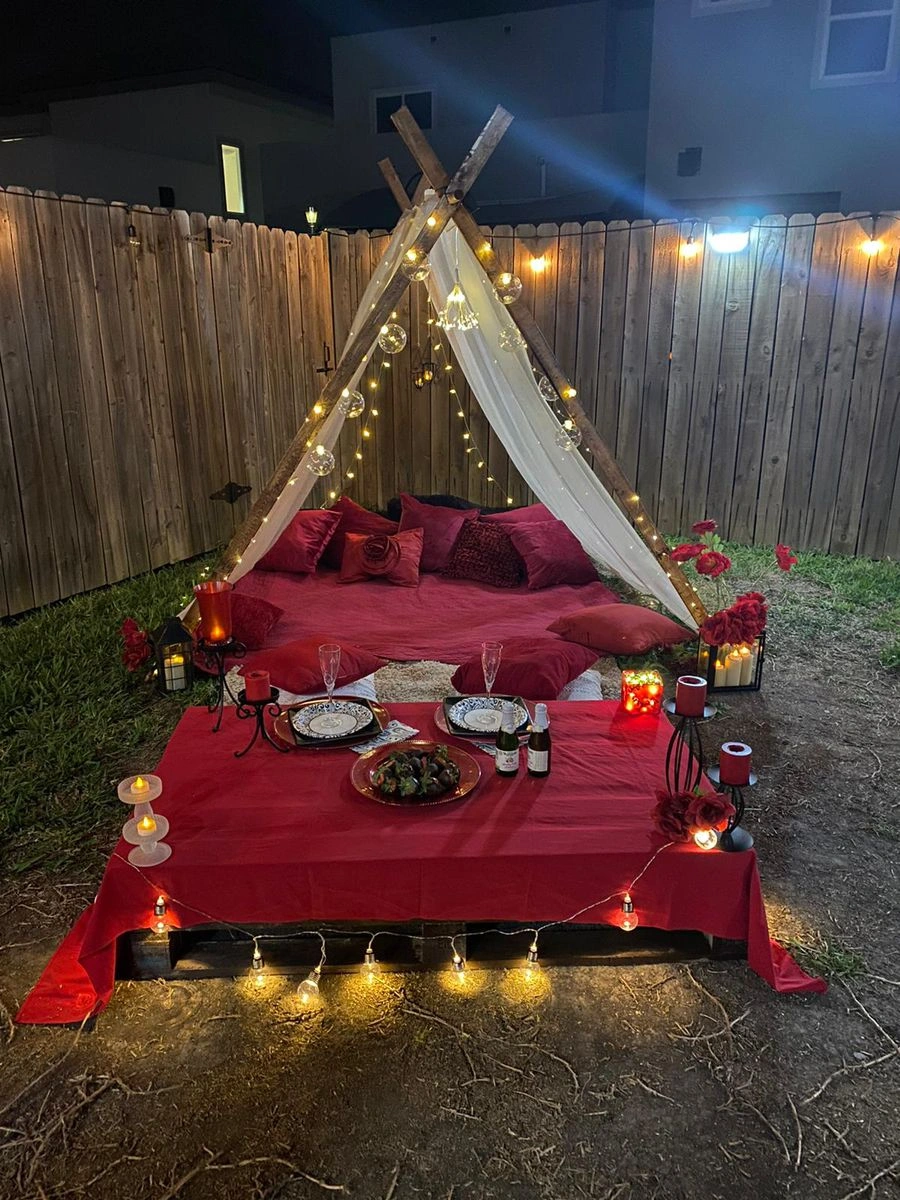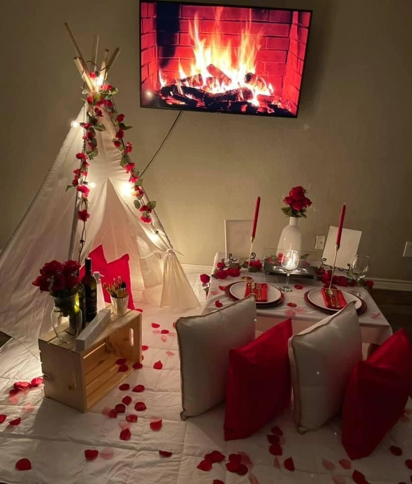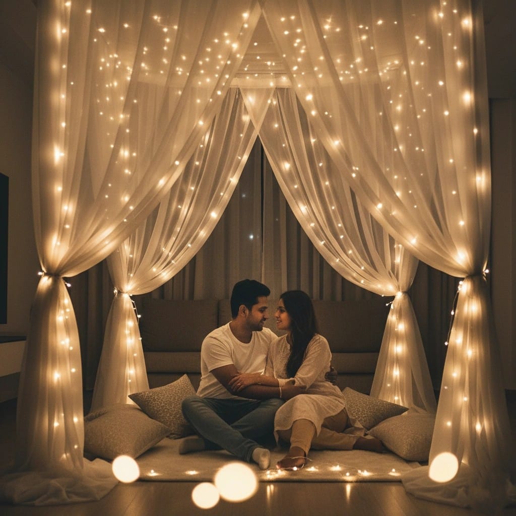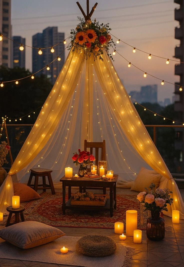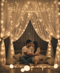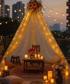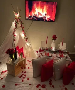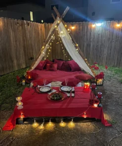 Step into a world where your most intimate dreams become reality with the breathtaking Love Canopy installation by Letscelebrate. This masterpiece features a sturdy wooden structure draped in a shimmering fairy light canopy, meticulously woven with a lush garden of red and white roses. To ensure your proposal, anniversary, or private dinner is truly magical, Letscelebrate accents the space with soft candlelight, plush furnishings, and an elegant “LOVE” centerpiece that radiates warmth and romance. Whether you are sharing a quiet supper or asking for a lifetime together, Letscelebrate handles every thoughtful detail to create a picturesque haven where you can lose track of time and cherish every second.