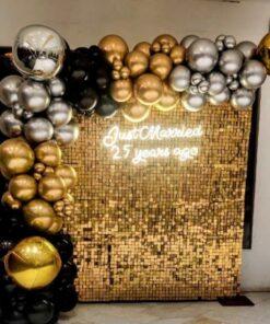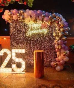 Ready to celebrate your anniversary in the most beautiful and glamorous way? Letscelebrate’s exclusive Rose Gold Sequins Anniversary Decor is designed to add a trendy, unforgettable touch to any anniversary party, whether it’s your own or for loved ones. This charming decor creates a gorgeous, attractive look that’s sure to impress your guests and stay in their minds long after the celebration! This picturesque setup features a dazzling 6×6 feet Rose Gold Sequin Panel — with its shimmering, high-quality sequins creating a “partylicious” vibe. A radiant “Happy Anniversary” neon signage casts a warm glow, beautifully complemented by an elegant arch of white latex and golden chrome balloons adorned with delicate rose gold butterflies. All these elements combine to give you a truly elegant decor perfect for your, your parents’, or your friends’ anniversary. With its soft, classy color combination, this decor is ideal for milestones like 1st, 25th, or 50th anniversaries, and it’s perfect for surprising any loved one!