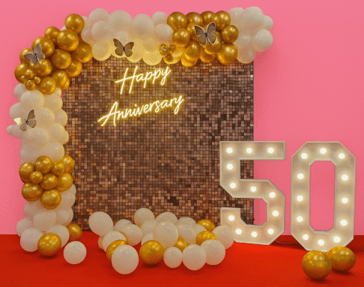 Ready to celebrate your anniversary in the most beautiful and glamorous way? Letscelebrate’s exclusive Rose Gold Sequins Anniversary Decor is designed to add a trendy, unforgettable touch to any anniversary party, whether it’s your own or for loved ones. This charming decor creates a gorgeous, attractive look that’s sure to impress your guests and stay in their minds long after the celebration! This picturesque setup features a dazzling 6×6 feet Rose Gold Sequin Panel — with its shimmering, high-quality sequins creating a “partylicious” vibe. A radiant “Happy Anniversary” neon signage casts a warm glow, beautifully complemented by an elegant arch of white latex and golden chrome balloons adorned with delicate rose gold butterflies. All these elements combine to give you a truly elegant decor perfect for your, your parents’, or your friends’ anniversary. With its soft, classy color combination, this decor is ideal for milestones like 1st, 25th, or 50th anniversaries, and it’s perfect for surprising any loved one!