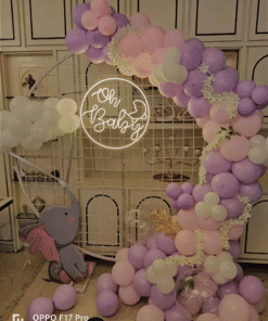 Celebrate your baby shower in the best way possible with LetsCelebrate’s adorable Baby Elephant Pastel theme Oh Baby Decor! Surprise the mom-to-be with this stunning neon light setup featuring a mesh stand, a charming Baby Elephant sun-board cutout, and glowing “Oh Baby” neon signage. A whimsical cloud formed with white latex balloons perfectly complements a beautiful arch of pastel pink and purple balloons, adorned with white flower strings, golden leaf sticks, and delightful bubble balloons. This elegant decor is also perfect for your child’s 1st birthday, half birthday, or any other milestone, ensuring a memorable and special celebration for everyone.