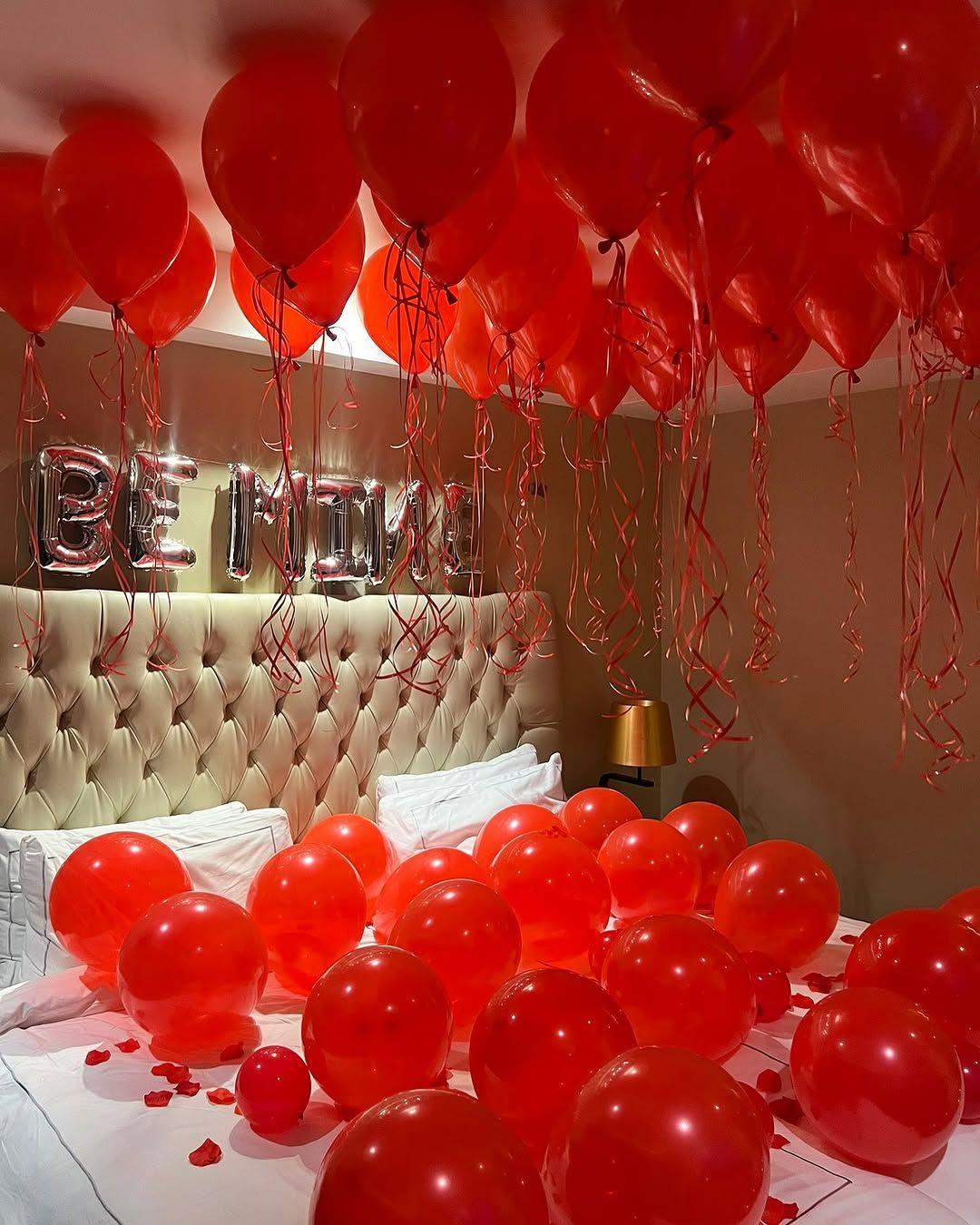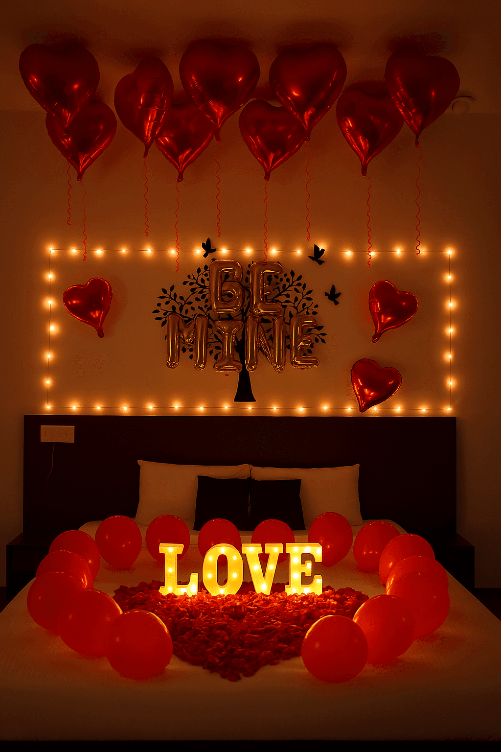 Ready to sweep your sweetheart off their feet? Let’s Celebrate’s “Be Mine” Special Decor is designed to infuse your home with love and create unforgettable romantic surprises. Perfect for anniversaries, proposals, or simply showing you care, this stunning setup features a blend of classic red balloons and elegant heart-shaped foil balloons, all setting a passionate mood. We personalize your decor with “Be Mine” foil letters, and you can even enhance the ambiance with optional LED “Love” letters and dreamy fairy lights. To complete this truly exotic and classy experience, we scatter aromatic fresh rose petals, making your special moments even more magical.