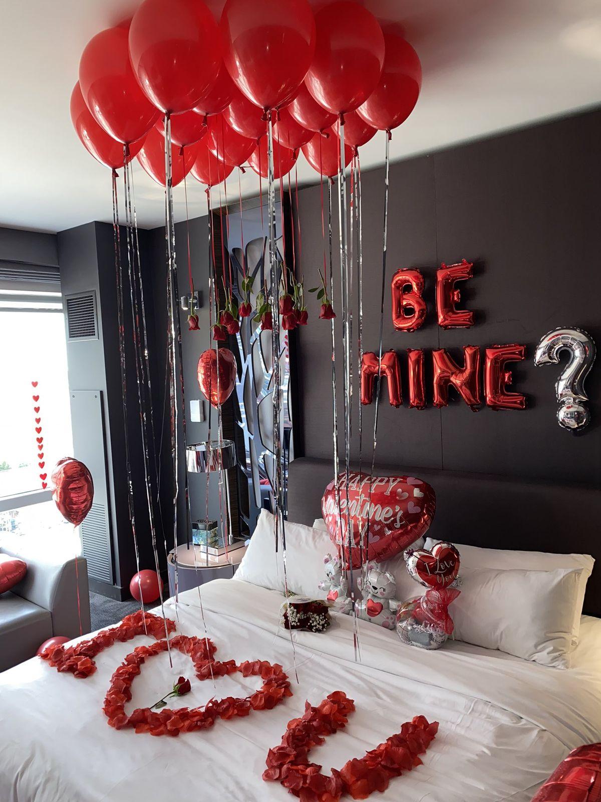 ✅ Twelve red heart-shaped foil balloons (stuck on the ceiling).