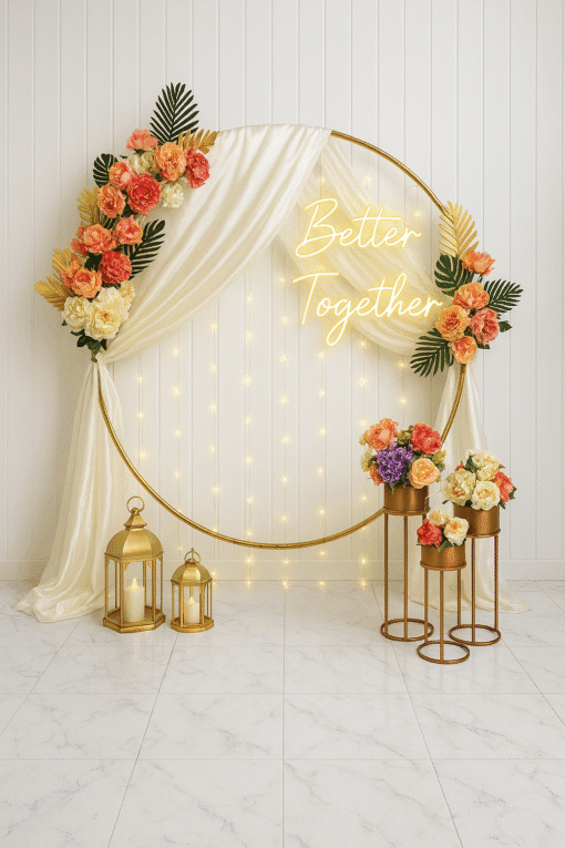 Ready to go beyond ordinary for your anniversary? Let’s Celebrate’s enchanting “Better Together” Anniversary Decorations are crafted to create truly unforgettable moments and surprise your loved one with a touch of magic. This unique setup features a white round stand, a captivating “better together” neon light, and elegant accents like flower bunches, pixel lights, golden cages, white lamps, and flower planters, all working together to set a charming and romantic ambiance. While perfect for anniversaries, this versatile decor can also elevate birthday parties, baby showers, or farewells. We can even customize your experience with additional LED lights, welcome boards, or other personal touches to match your vision. Let’s Celebrate helps you make your special day extraordinary, because you’re always “better together!”