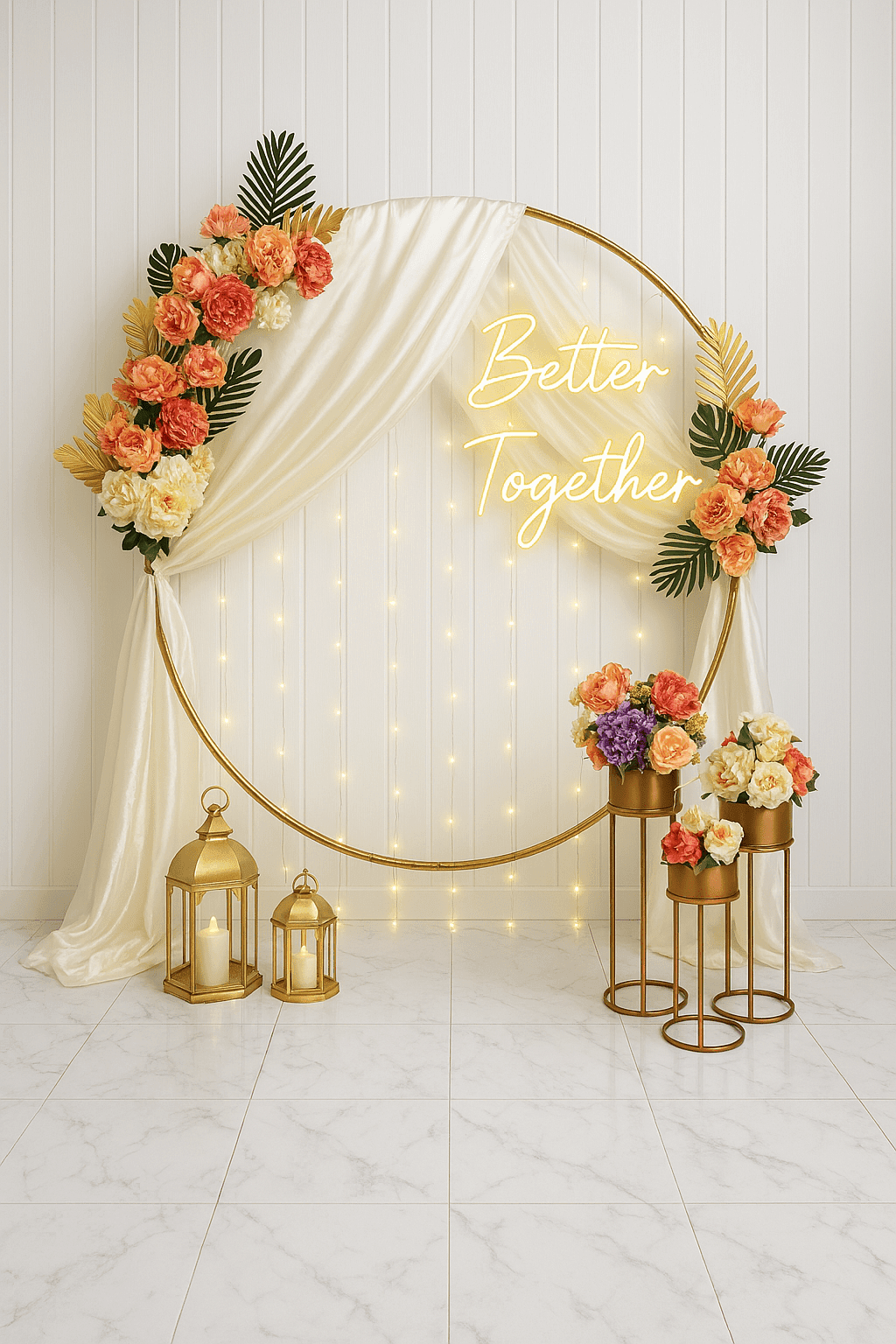 ✅ Six by six feet round stand, Better Together neon light, twenty flower bunches and seven meter white fabric.