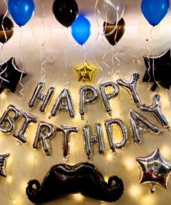 Ready to make your loved one feel ecstatic on their birthday? Letscelebrate offers a charming Blue & Silver Themed Happy Birthday Decor perfect for surprising friends, partners, parents, or siblings right at home! This heartfelt simple birthday decoration features “Happy Birthday” silver letter foil balloons, a fun mustache black foil balloon, two black and two silver star-shaped foil balloons, and 50 each of black and silver metallic foil balloons. Illuminated by a delicate fairy light, this elegant decor radiates a joyful celebration vibe, ensuring truly memorable moments for everyone.
