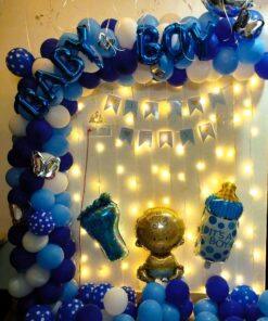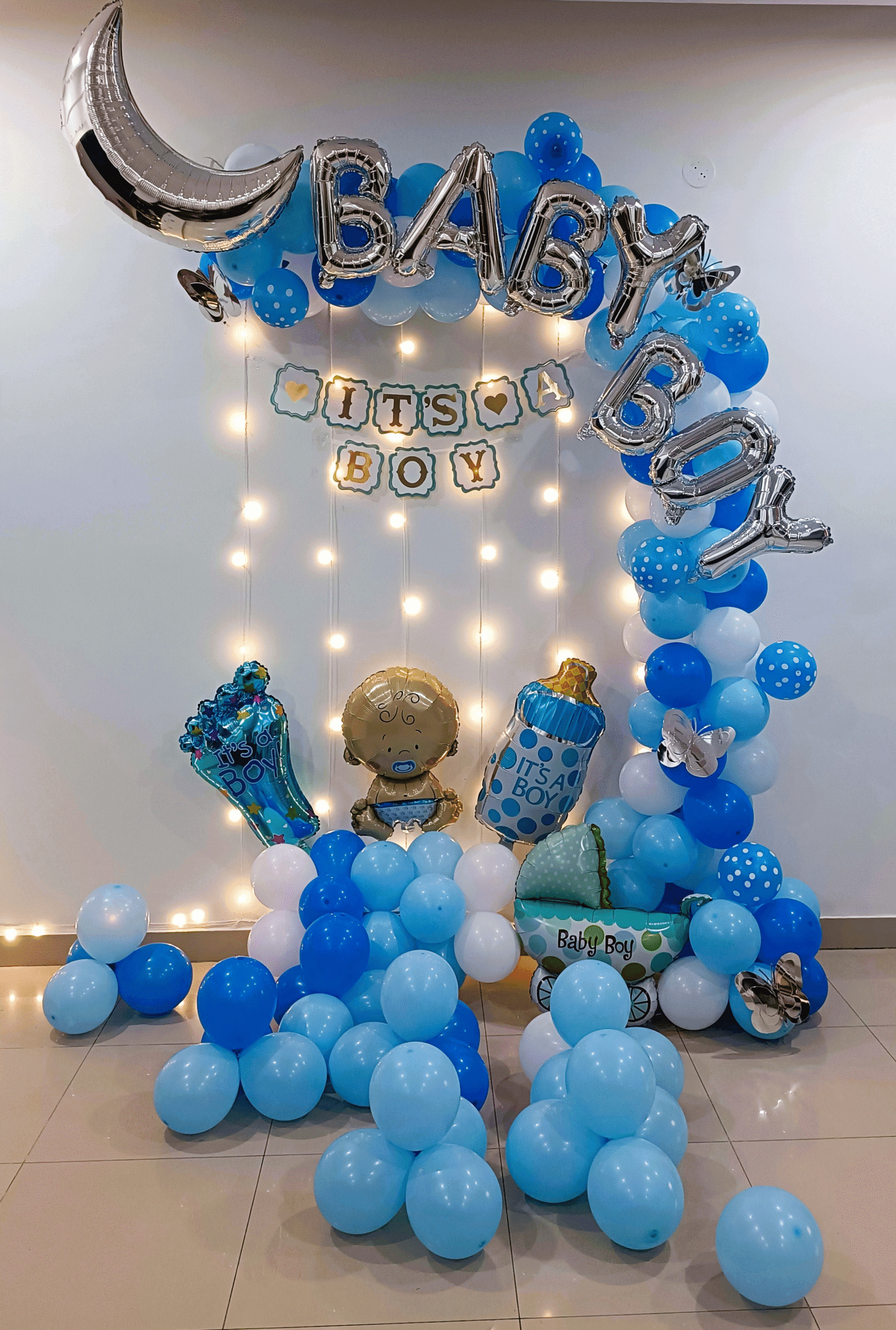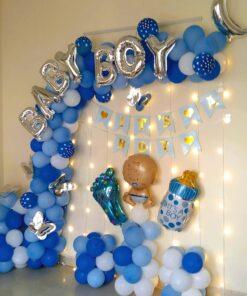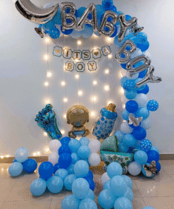 Welcome your baby boy home with a grand and unforgettable celebration! Letscelebrate’s gorgeous Blue Welcome Baby Boy Decor is designed to add beauty and joy to your special occasion, making it perfect for a welcome home party, naming ceremony, or even his first birthday. This stunning package features a beautiful balloon arch with blue pastel, dark blue, light blue, and white balloons, decorated with charming polka dot balloons and silver butterflies. The decor is completed with an adorable assortment of themed foil balloons, including a “Baby Boy” balloon, a moon-shaped balloon, and cute baby feet and bottle balloons. With free-floating balloons and a captivating Pixel LED light, this decor will speak for itself, creating a truly memorable and joyful atmosphere.