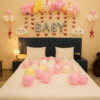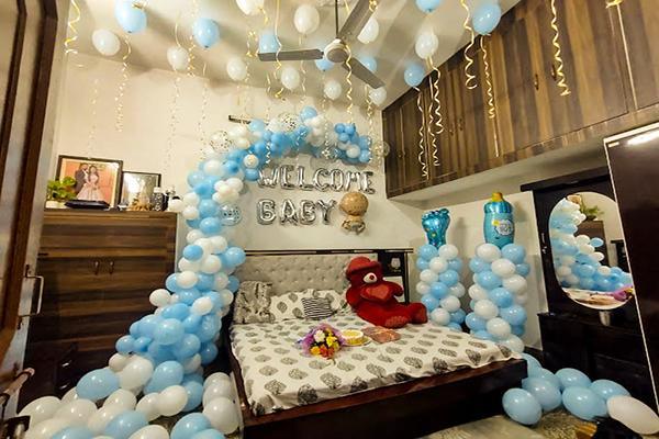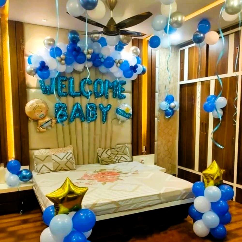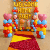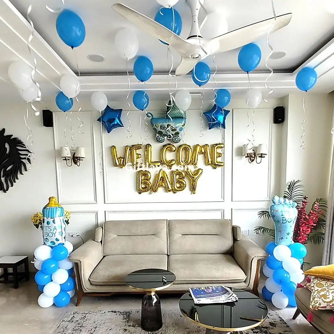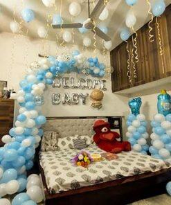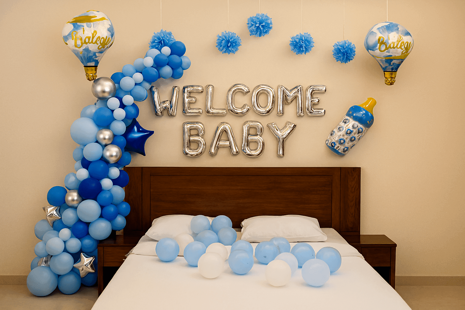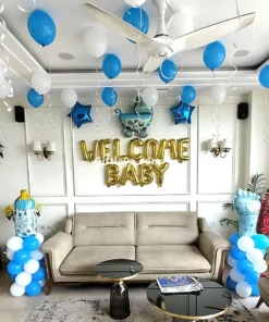 Step into a vibrant embrace with Letscelebrate’s “Welcome Baby Boy” room arrangement, designed to beautifully celebrate your newborn’s arrival. This captivating decor features a stunning arch of bright pastel and metallic blue balloons, perfectly complemented by heartfelt “Welcome Baby” foil letters. Floating and anchored balloons infuse the space with soft whimsy, while themed accents like a baby bottle foil balloon, star balloons, and cozy pompom drapes complete the enchanting look. More than just decoration, Letscelebrate crafts a warm, inviting hug for your baby’s first precious moments at home, ensuring an unforgettable start to their journey!