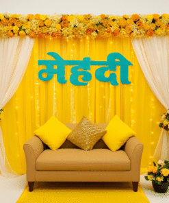 Letscelebrate offers a spectacular Golden and Yellow Mehndi decor package for your special day. Searching for a luxurious Haldi and Mehndi theme or yellow and gold wedding decor? Our theme is designed to bring richness, elegance, and positivity to your celebration. With a blend of traditional garlands, modern accessories like pixel lights and transparent tables, and comfortable low-seating, this decor creates a visually stunning and inviting space. Choose Letscelebrate to make your Haldi and Mehndi ceremonies an unforgettable display of style and tradition.