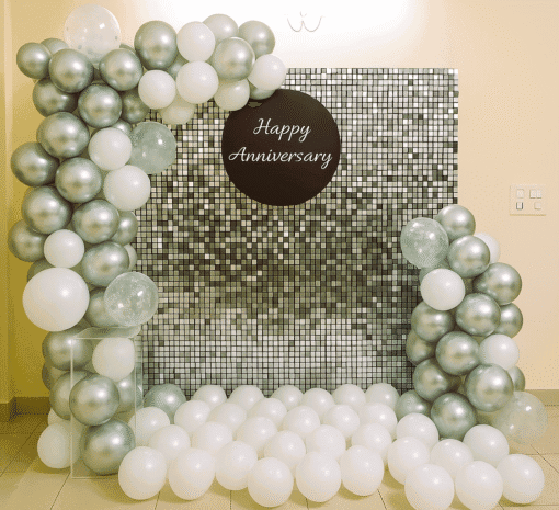 Ready to make your or your loved ones’ anniversary truly shine? Let’s Celebrate’s Classy Silver Anniversary Sequin Decor is designed to bring full enthusiasm and excitement to any milestone celebration, from your 1st to your 50th, or even for your parents’ special day! This elegant decoration effortlessly transforms your chosen location – be it your home, room, or hall – into an unforgettable party space, making anniversary planning a breeze. Our stunning setup features a dazzling 6×6 feet Silver Sequin Panel, a prominent “Happy Anniversary” cutout, and a magnificent arch crafted with white latex, silver chrome, and silver confetti balloons, creating a perfectly cohesive and bright celebratory aura. This gorgeous decor is also an ideal choice for a romantic surprise, ensuring every anniversary, including those big 16th, 18th, 25th, 30th, and 50th milestones, is celebrated in unparalleled style.