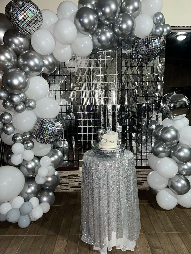 ✅ Arch of one hundred and fifty-four balloons of colors, including seventy white latex balloons, eighty silver chrome balloons, and four bubble balloons filled with silver confetti.
