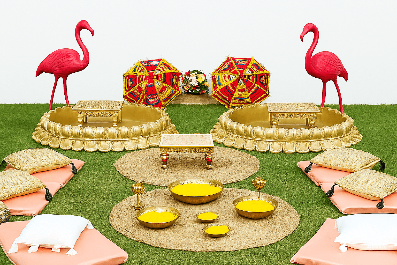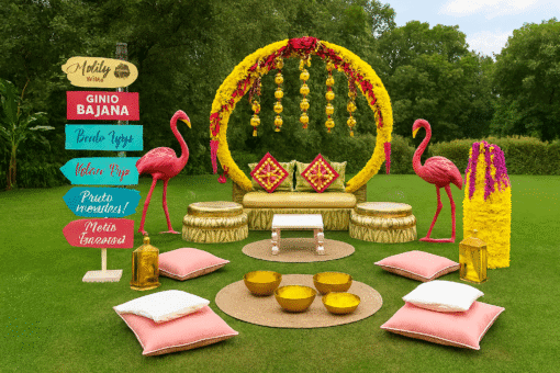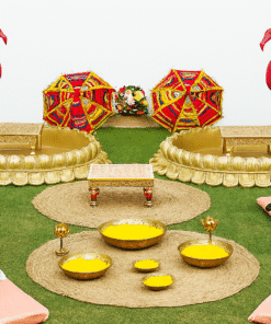 Letscelebrate offers the most enchanting Lotus Urli Haldi Decor to make your celebration glamorous and meaningful. Searching for traditional Haldi decor ideas or a luxury Haldi theme with urlis? Our setup, featuring elegant lotus urlis, golden chowkis, and beautiful brass lamps, is perfect for adding a sophisticated touch to your event. This comprehensive package includes everything from Rajasthani umbrellas to charming flamingo statues, ensuring every detail is picture-perfect. Choose Letscelebrate for a one-of-a-kind Haldi decor that brings positive vibes and undeniable elegance to your special day.