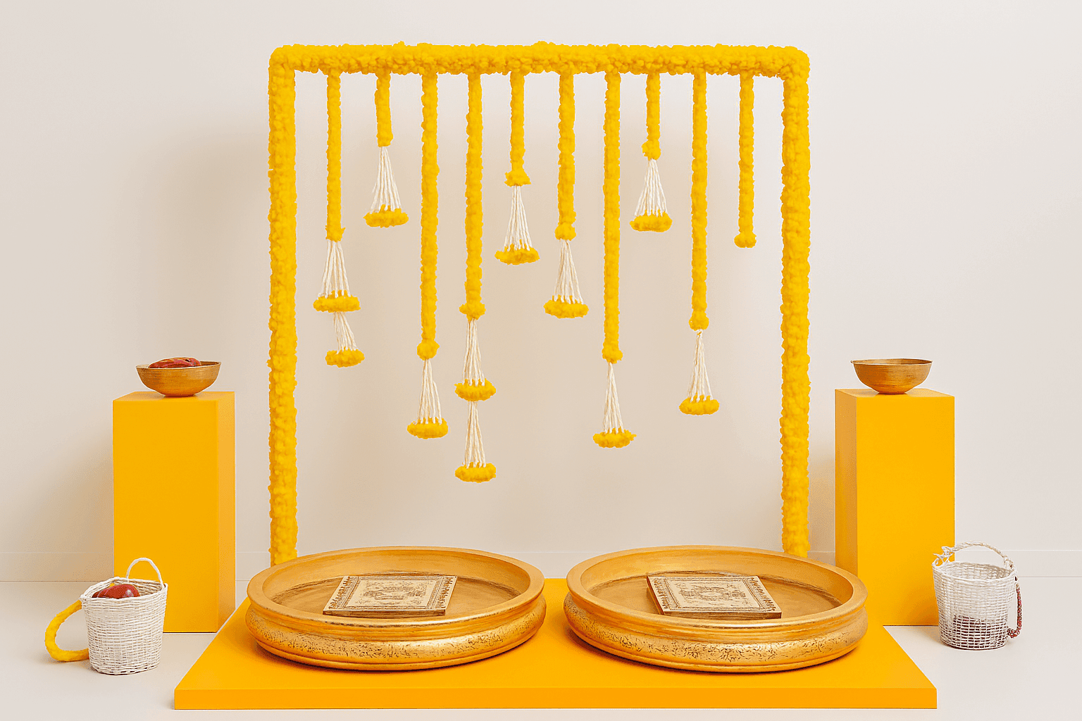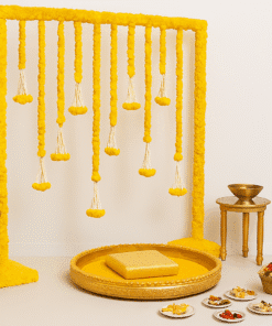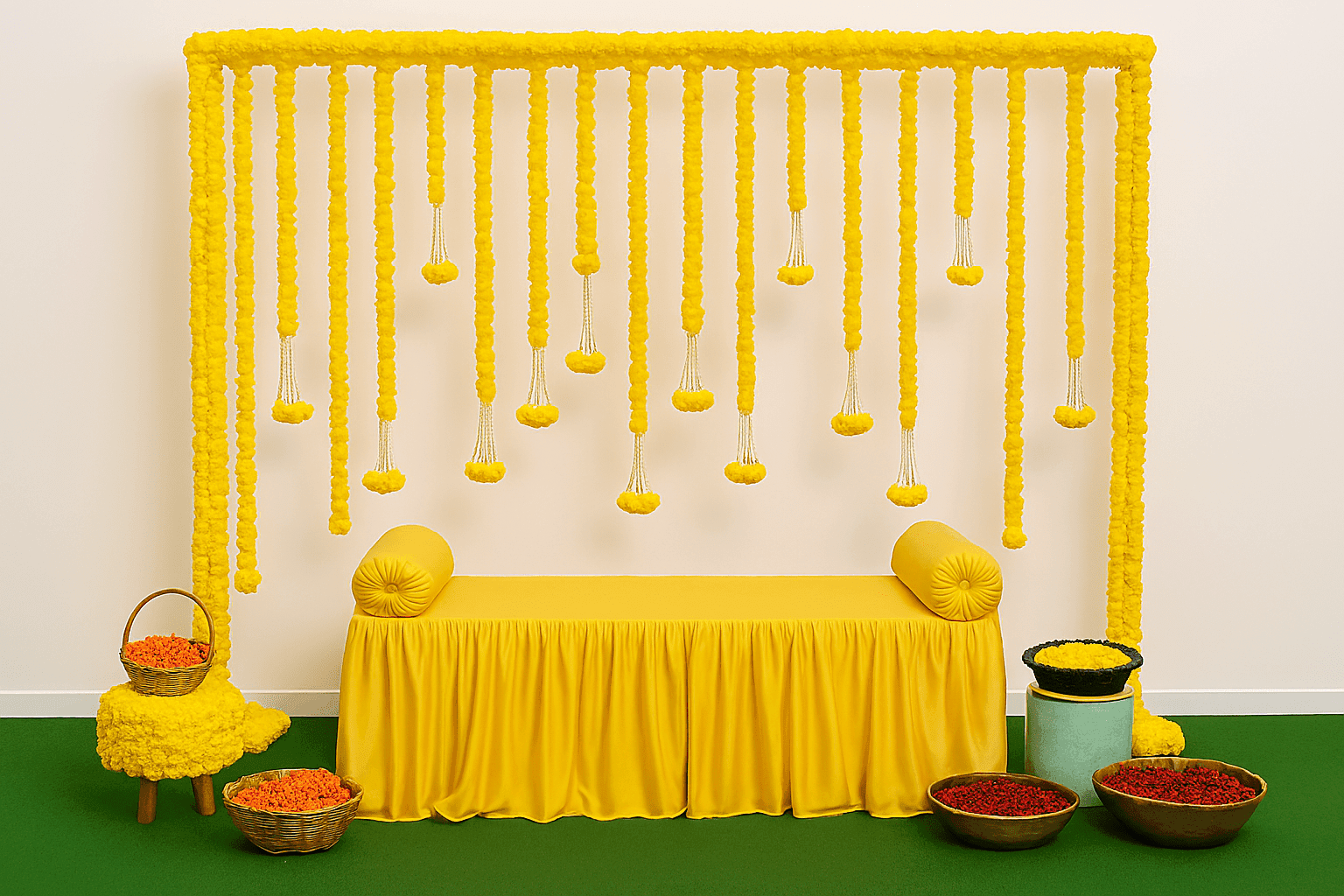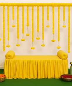 ✅ One rectangle stand draped with fifteen fresh yellow garlands and fifteen yellow garlands with tassel.