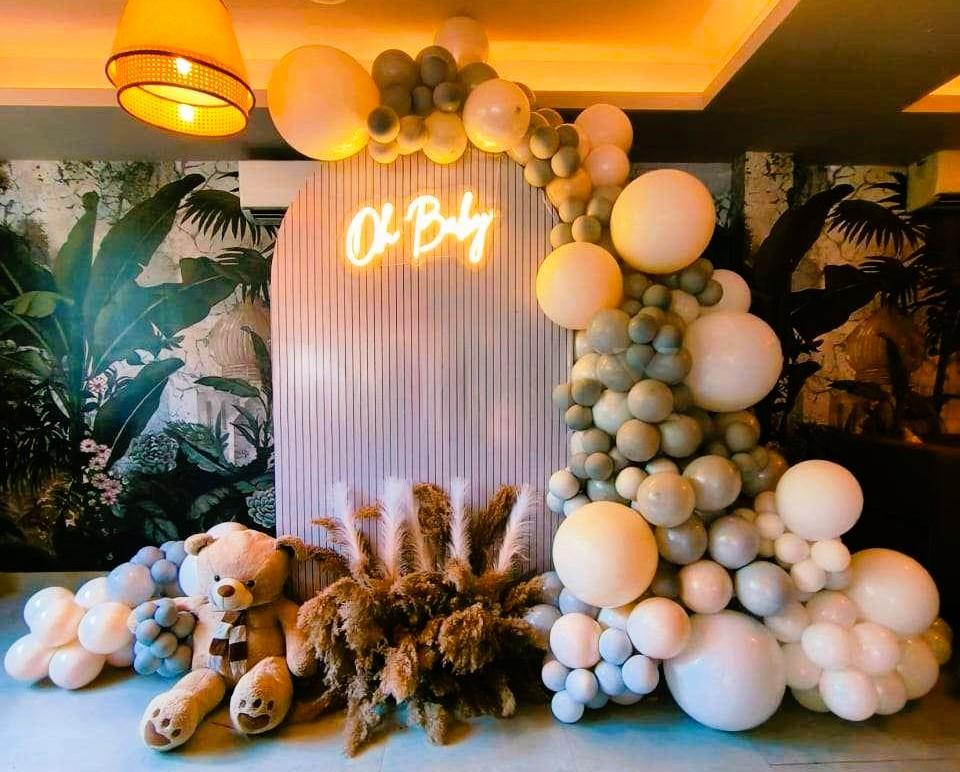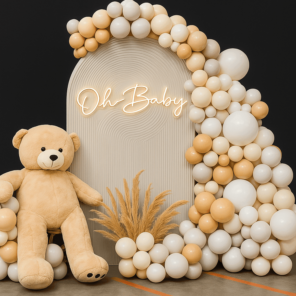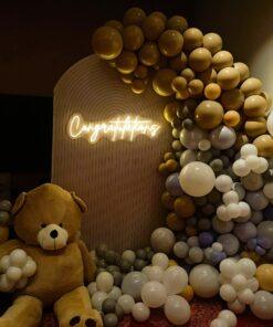 Embark on your journey to motherhood with a heartwarming celebration! LetsCelebrate presents our enchanting “Cocoa Bear” themed baby shower decorations, designed to bring joy and comfort to your special day. Picture a delightful setup featuring a sun board cutout adorned with grey pastel, retro off-white, vintage apricot, and choco brown balloons, perfectly complemented by an “Oh Baby” neon light with a cute teddy bear. This adorable decor, complete with ribbons, pampas grass, and macaron balloons, is ideal for surprising the mom-to-be, welcoming your little one, or even for a naming ceremony. Let us create timeless memories against this beautiful backdrop, as delightful and comforting as a teddy bear’s cuddle!