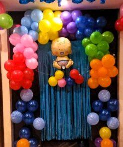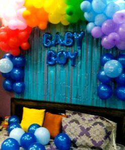 Celebrate the most beautiful moment of your life with our vibrant Welcome Baby Boy Decor. This exclusive package combines brightness and beauty, allowing you to express your joy and love to the fullest as you welcome your new son. The colorful balloons symbolize the cheerfulness and affection he brings into your home. This decor package is designed to be a true expression of love and happiness. It features a spectacular rainbow-like arch made from 140 balloons, including pastel blue, red, pink, orange, yellow, green, and purple. This vibrant display is perfectly complemented by a set of “Baby Boy” letter foil balloons, a backdrop created with two pastel blue curtains, and six “It’s a Boy” printed balloons. The setup is completed with 30 free-floating pastel blue balloons, adding a dreamy touch to your celebration.