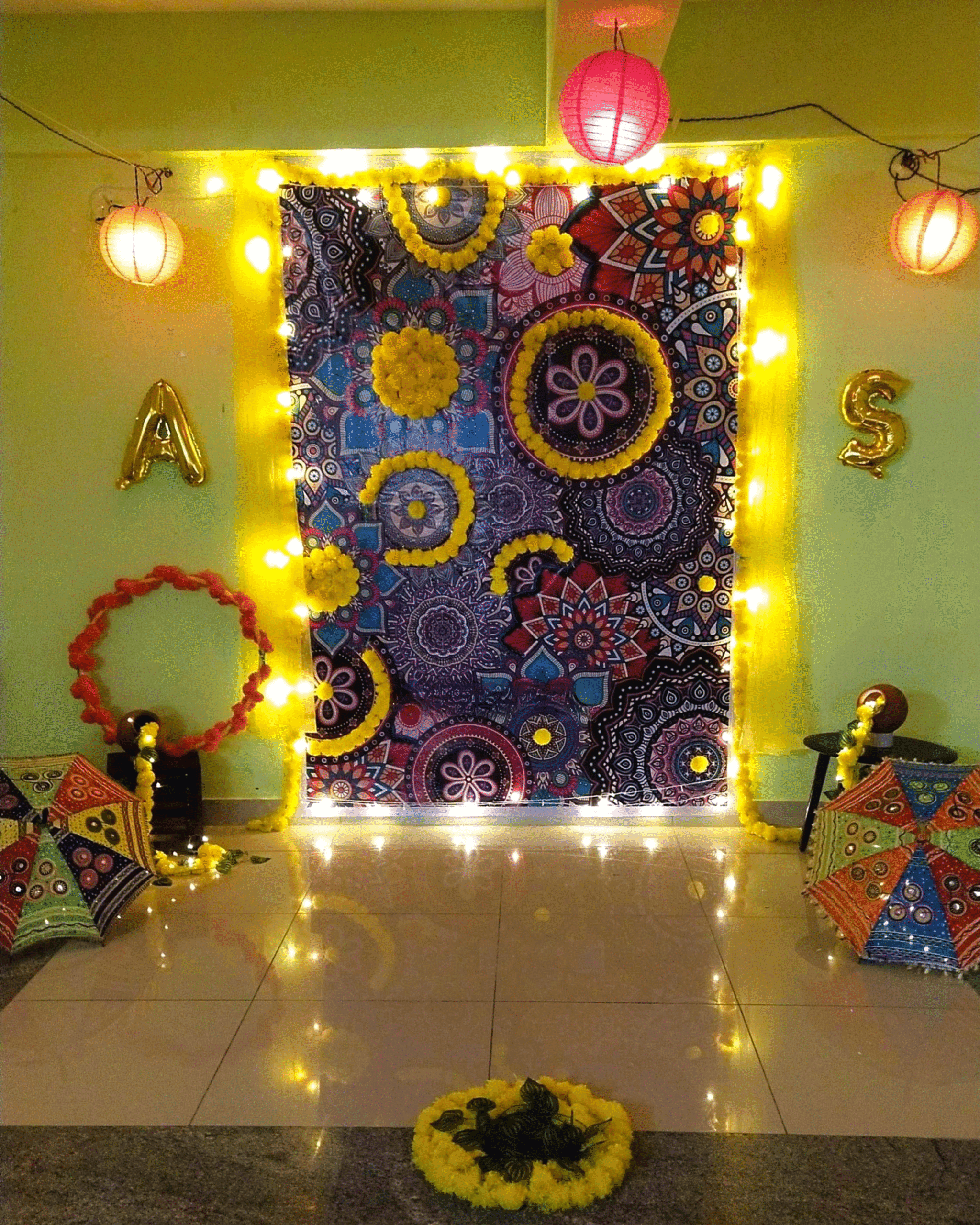 ✅ One small circle on the floor made with two yellow flower garlands and one green leaf string.