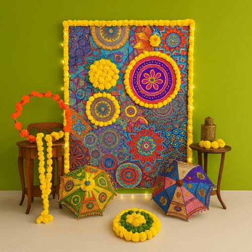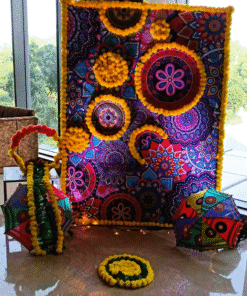 Celebrate Diwali with new hope and positivity using our newly launched Mandala Backdrop Diwali Decoration from Letscelebrate. This unique decor blends traditional festive charm with vibrant colors to create a warm and inviting atmosphere for your celebration. The centerpiece is a magnificent 7×5 ft Mandala backdrop adorned with yellow garlands, a Rajasthani umbrella, and warm LED lights. To complete the festive look, the decor includes a photo selfie frame decorated with flower garlands, a floral rangoli-style floor design, and beautifully embellished pots. This gorgeous and versatile setup is also perfect for wedding functions like Haldi or for other festivals such as Ganesh Chaturthi and Navratri.