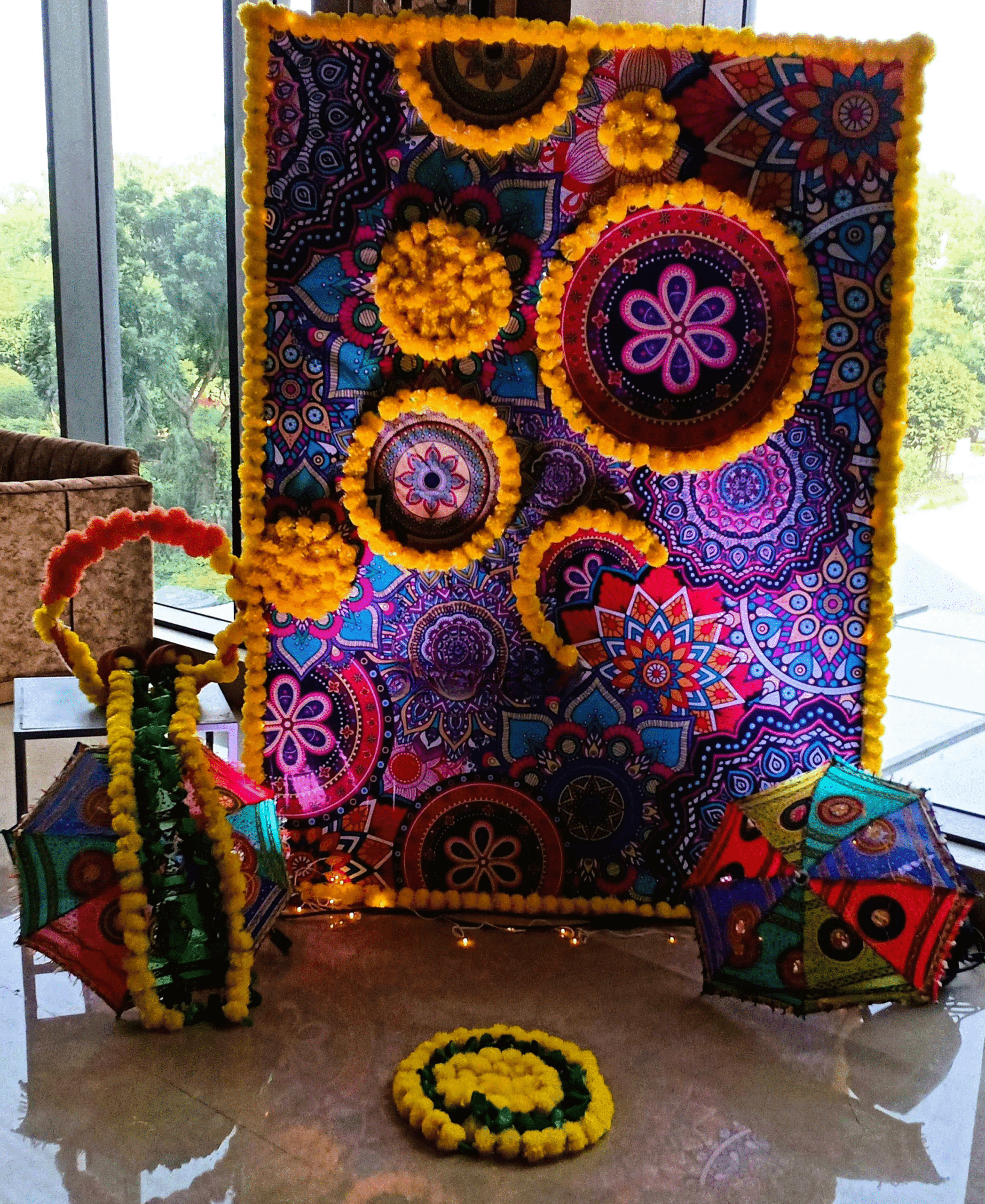 ✅ One seven by five feet Mandala flex backdrop decorated with fourteen yellow garlands.