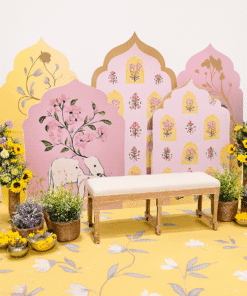 Letscelebrate offers a truly unique Haldi and Mehndi decoration idea with our Pastel Royal Decor. Searching for a palace-style wedding backdrop or elegant Haldi themes? Our setup, with its intricate floral arches and traditional lotus motifs, is perfect for couples who want to blend classic charm with a lively atmosphere. This decor provides a beautiful setting for all your photos and creates a memorable experience for your guests. With Letscelebrate, you’re not just getting decor; you’re creating a haven where every moment becomes a cherished memory.