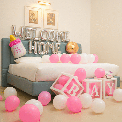 Celebrate your baby girl’s arrival with Letscelebrate’s enchanting white and pink Welcome Baby Girl decoration, designed to create a warm and stylish ambiance. Featuring elegant net fabric, charming font blocks, and soft hues, this thoughtfully curated setup ensures a memorable ‘Welcome Home Baby’ moment for your family. Perfect for baby showers or homecomings, our decor transforms any space into a cozy celebration of love and joy. Trust Letscelebrate to make your little princess’s welcome a magical experience that answers your search for the best baby girl decoration ideas.
