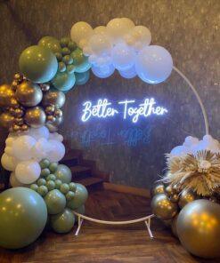 Ready to make your anniversary an enchanting celebration filled with beauty and romance? Let’s Celebrate’s exquisite floral decorations are meticulously curated to create a mesmerizing ambiance, whether you’re commemorating one year or decades of cherished memories. Step into a dreamy wonderland adorned with a stunning assortment of fresh flowers in vibrant hues, symbolizing the beautiful journey of your love. Our captivating backdrop features a delightful combination of white, chrome green, and chrome pink balloons, perfectly complemented by a radiant “Better Together” neon light and twinkling pixel lights, casting a warm, golden glow over your special event. With the perfect finishing touches of elegant flower bunches and delicate rose gold butterfly cutouts, this decor is truly a feast for the eyes, promising an anniversary celebration that will leave you both spellbound.