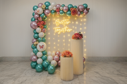 Ready to make your anniversary an enchanting celebration filled with beauty and romance? Let’s Celebrate’s exquisite floral decorations are meticulously curated to create a mesmerizing ambiance, whether you’re commemorating one year or decades of cherished memories. Step into a dreamy wonderland adorned with a stunning assortment of fresh flowers in vibrant hues, symbolizing the beautiful journey of your love. Our captivating backdrop features a delightful combination of white, chrome green, and chrome pink balloons, perfectly complemented by a radiant “Better Together” neon light and twinkling pixel lights, casting a warm, golden glow over your special event. With the perfect finishing touches of elegant flower bunches and delicate rose gold butterfly cutouts, this decor is truly a feast for the eyes, promising an anniversary celebration that will leave you both spellbound.