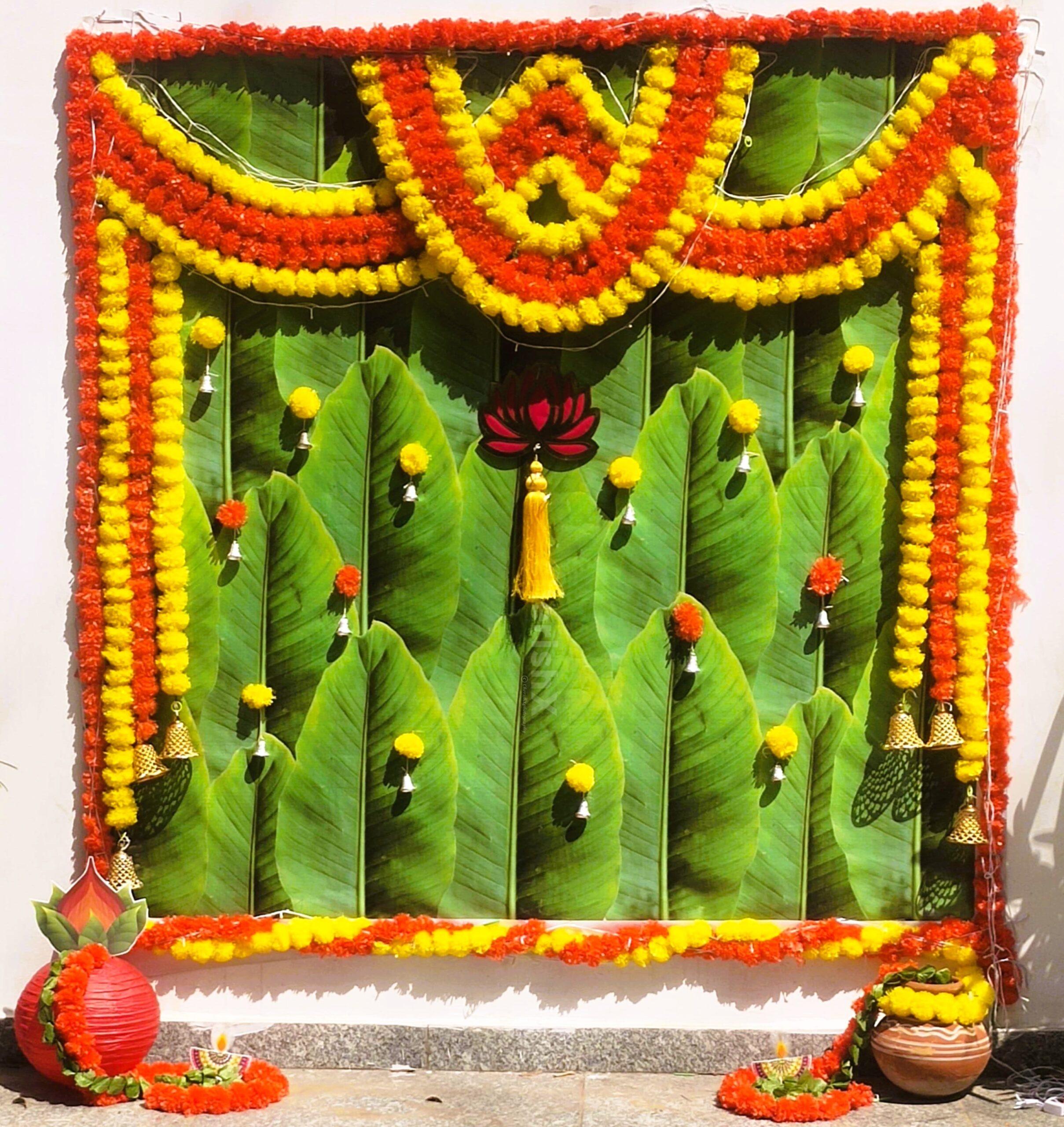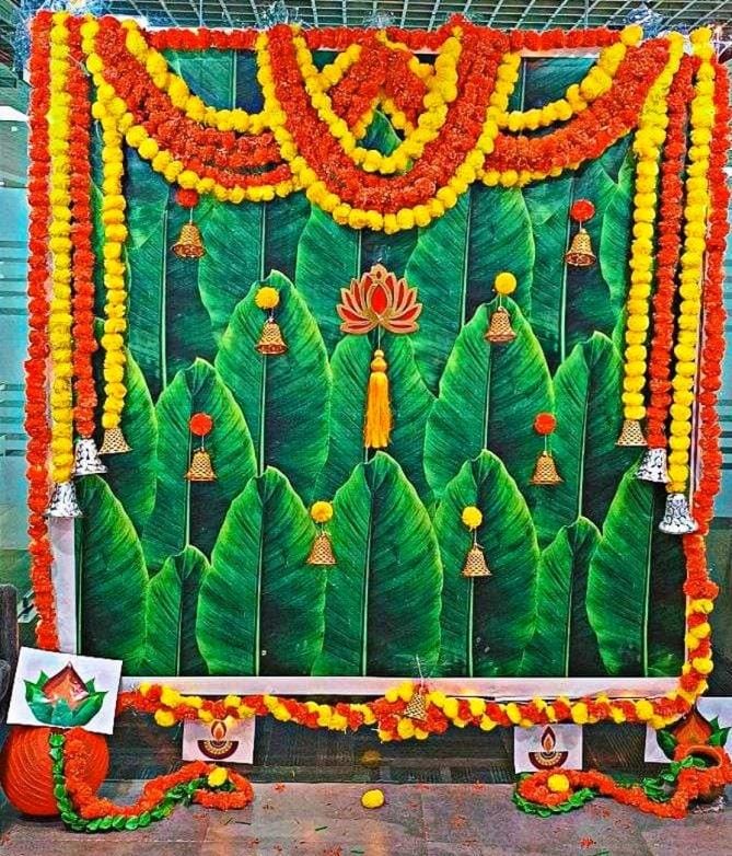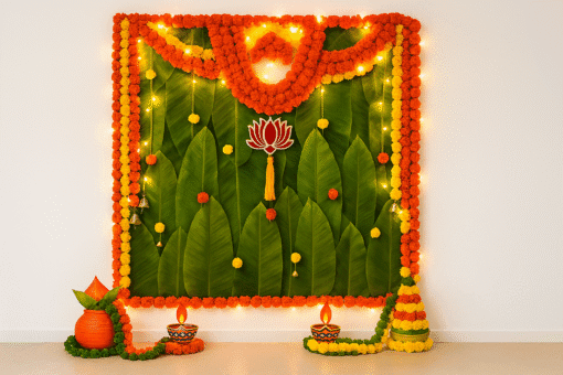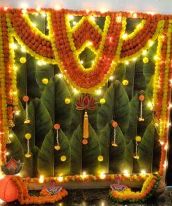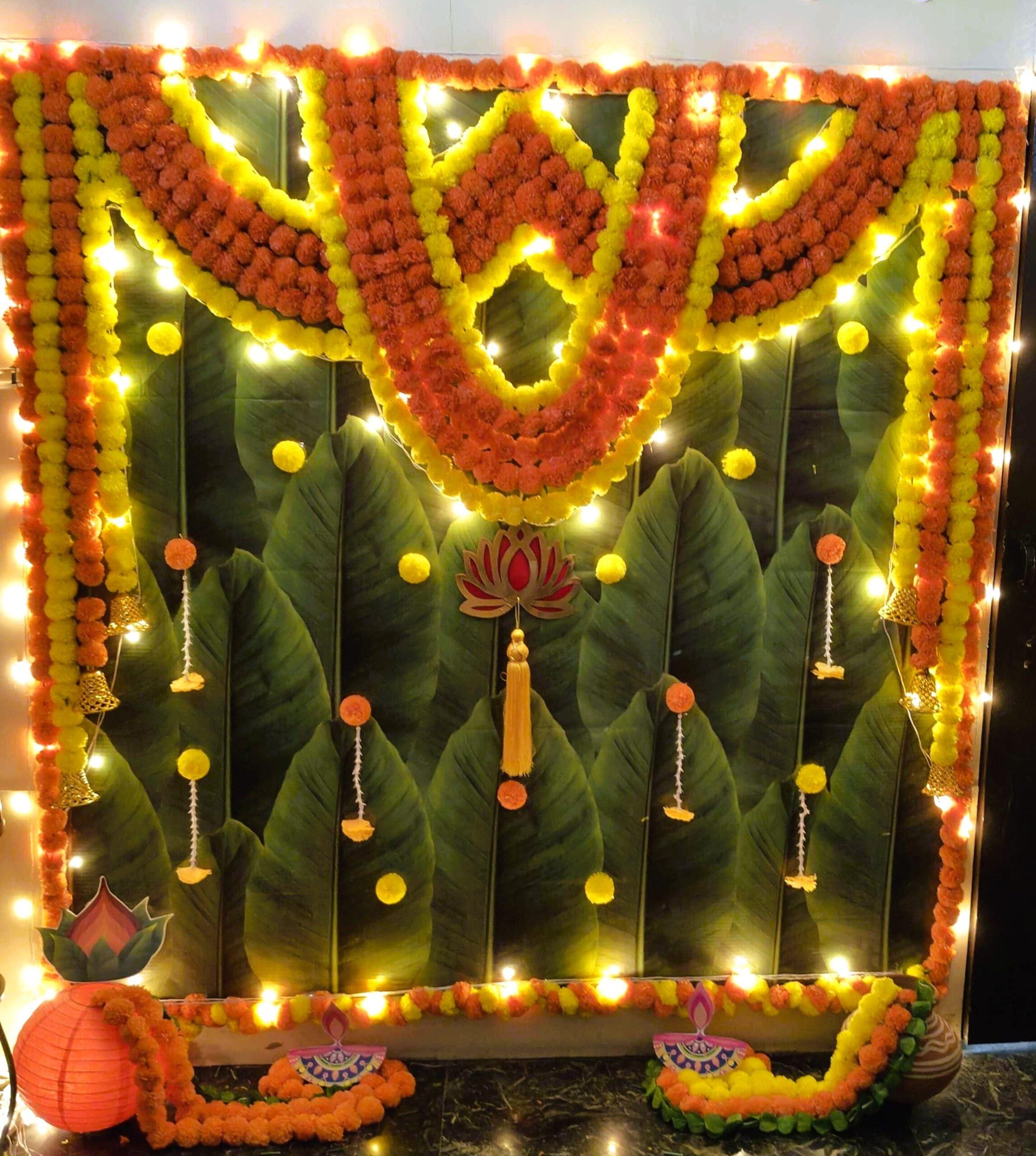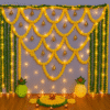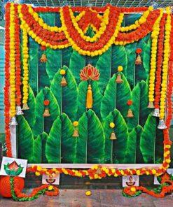 Make your wedding season truly magical with our enchanting Foliage & Garland Decor Backdrop by Letscelebrate. This versatile decor is perfect for creating a joyful and uplifting atmosphere for any celebration. This elegant backdrop features a beautiful symphony of lush leaves, vibrant orange and yellow garlands, and twinkling pixel lights. The charm is enhanced with delicate lotus cutouts, glistening golden and silver bells, and verdant green Pan Strings, all arranged around a medium-sized Mud Pot. Our talented decorators will handle the installation, ensuring a hassle-free experience so you can focus on radiating joy and creating unforgettable memories.