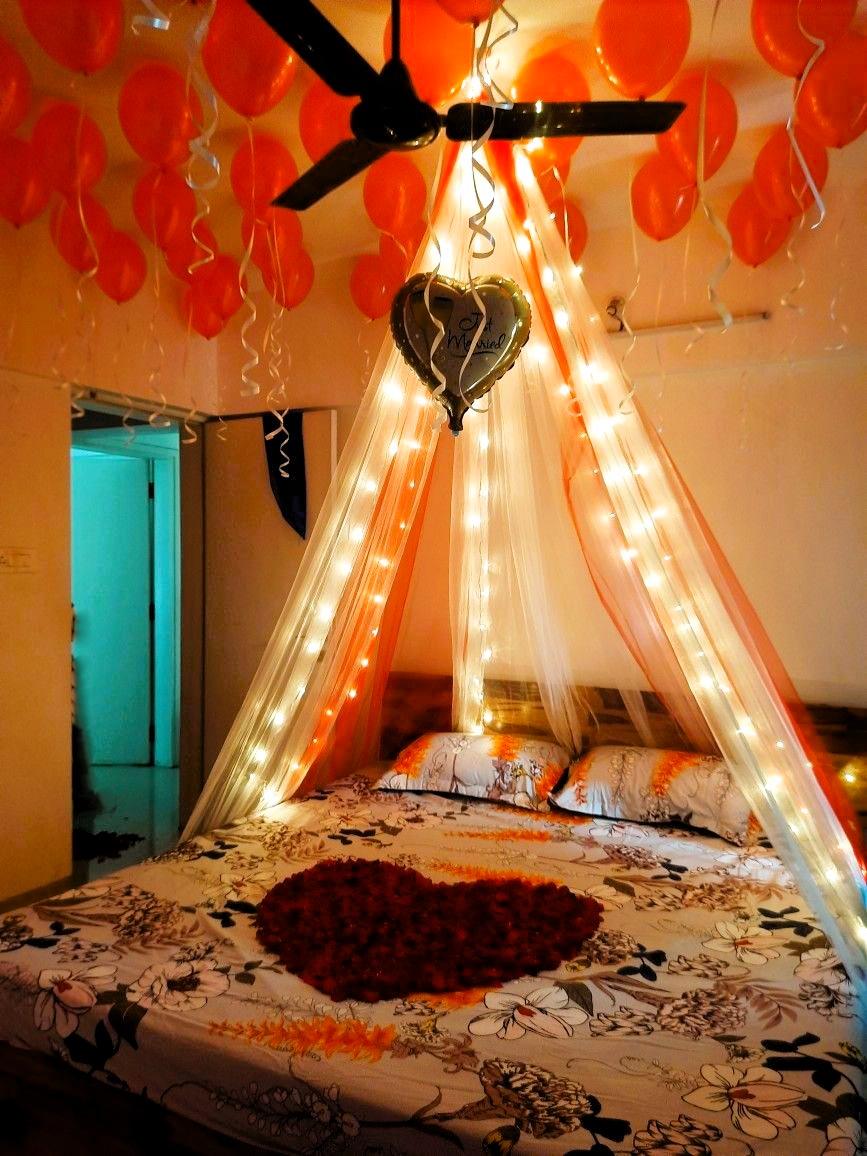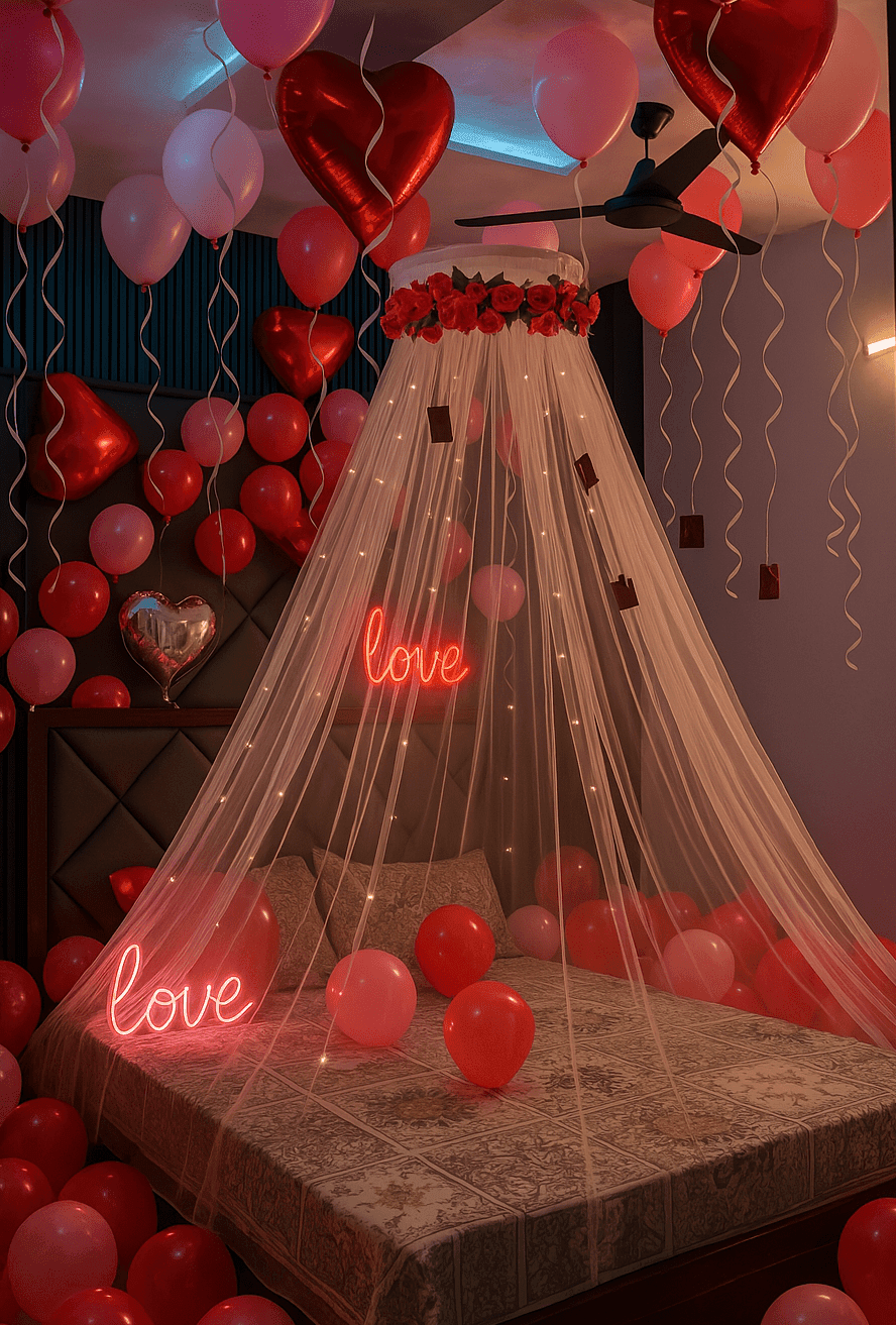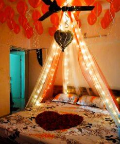 Your first night together is a truly special occasion, and what better way to celebrate than with a breathtaking surprise for your partner? Letscelebrate brings you our stunning First Night Red Balloon Canopy Decor, designed to create an unforgettable, romantic ambiance in your room. Imagine this: a dreamy canopy adorned with fairy lights, a beautiful red “Love” cursive foil balloon, and a charming mix of red and silver heart-shaped foil balloons. We’ll complement this with 100 red balloons and 6 ceiling balloons from which your cherished photos will gracefully hang, adding a deeply personal touch. To complete this exquisite setup, we include a Love LED light and additional battery-operated lights, ensuring your room glows with romance. Let Letscelebrate help you craft a magical and memorable first night!