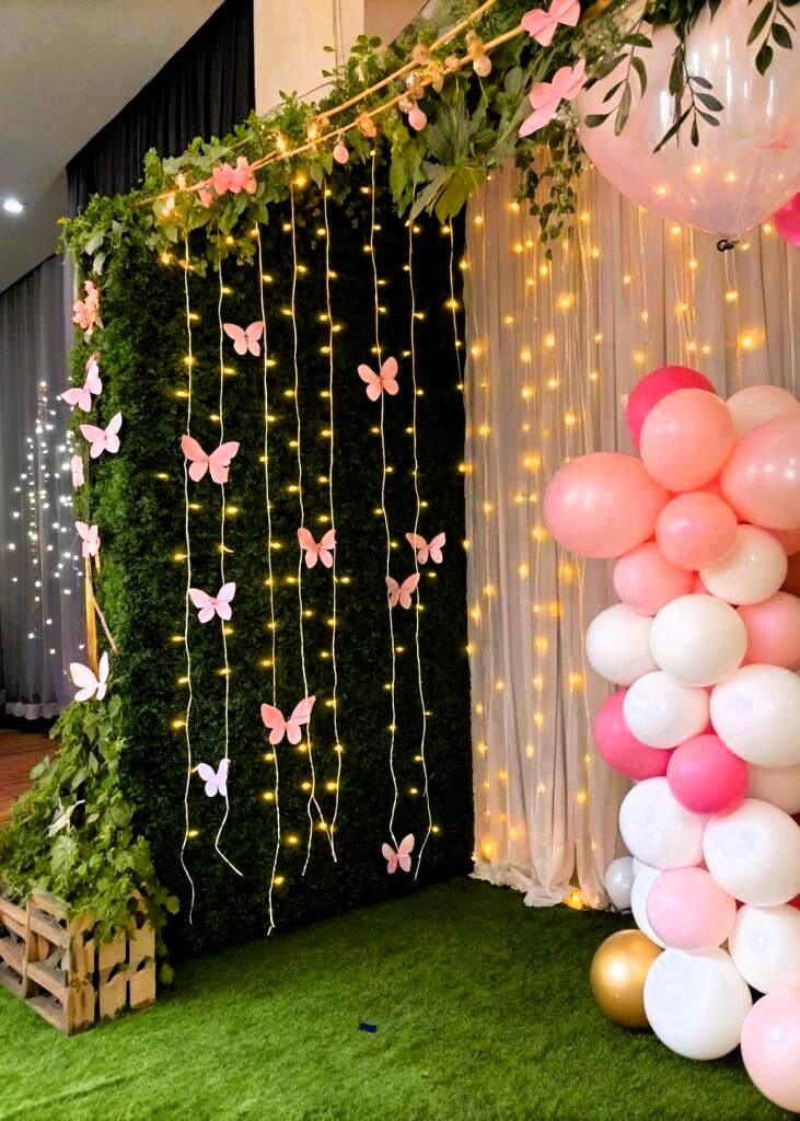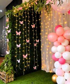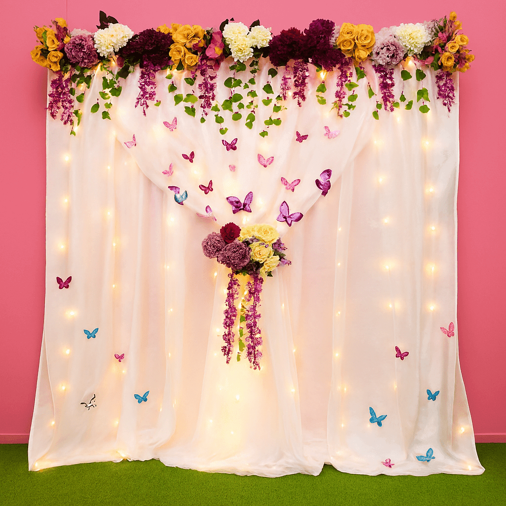 Mark the arrival of your new baby with a backdrop as enchanting as the moment itself! Letscelebrate’s serene White Satin and Net Baby Decor is perfect for a gender-neutral baby shower or a welcome baby party, creating a cozy and whimsical atmosphere. This stunning arrangement features a backdrop of white satin and net, adorned with delicate artificial flowers and rich greenery. Soft pixel lighting provides a warm ambiance, while charming paper butterflies seem to drift along the drape like little messengers of happiness. A central flower pedestal is perfect for displaying baby photos or gifts. This harmonious blend of coziness and whimsy makes for an ideal setting to celebrate your new arrival.
