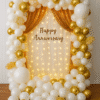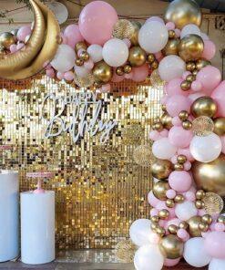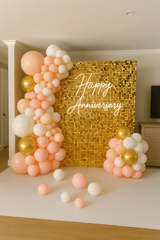 Ready to make your special occasions truly unforgettable? Letscelebrate presents our exclusive Stylish Golden Sequin Decoration, perfect for everything from baby showers and bachelorette parties to anniversaries and more! Sequins are undeniably trendy and add instant glamour, ensuring this decor makes any event memorable. With the addition of gorgeous balloons, the entire setup looks stunning and grand, promising an unforgettable party experience. This classy decoration features a dazzling 6×6 feet Gold Sequin Panel and a vibrant Neon Signage. A beautiful arch crafted from pink pastel, white latex, golden chrome, and macaron balloons completes this perfect arrangement. Versatile for birthdays, bridal showers, or significant milestones like Silver and Golden Jubilee Anniversaries, you can even customize it with banners to perfectly match your occasion. Surprise your loved ones with this impressive decor and let the celebrations begin!