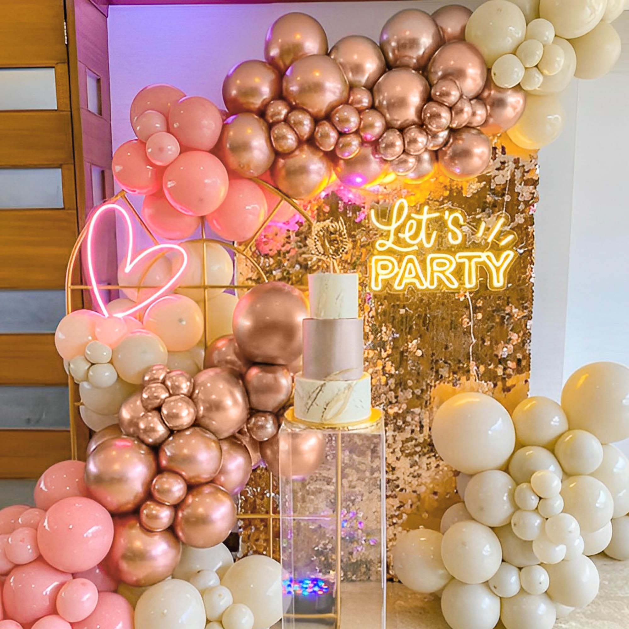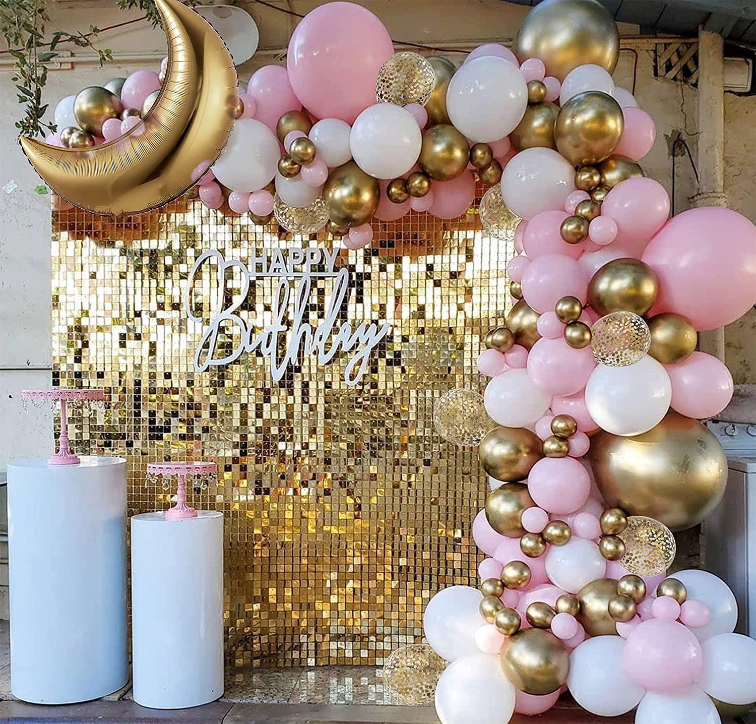 ✅ Arch of two hundred balloons, including sixty pink pastel balloons, forty peach pastel balloons, ninety white latex balloons, ten golden chrome balloons, and three macaron balloons.