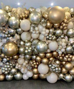 ✅ Fifteen metallic grey and fifteen golden balloons strewn aesthetically on the floor.