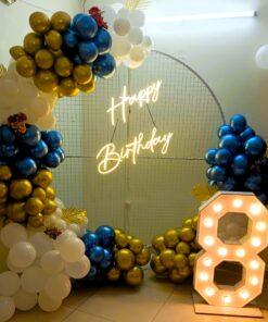 Looking for a stunning birthday surprise decoration? Letscelebrate’s Golden Galaxy Birthday Decor is your perfect solution, featuring a captivating blend of blue, golden, and white balloons with a “Happy Birthday” neon light. This exquisite surprise party decoration is ideal for birthdays, anniversaries, or baby showers, transforming any space from an intimate room to a grand hall. Capture insta-worthy moments with this elegant backdrop, creating unforgettable memories and bringing priceless joy to your loved one’s special day. Explore our add-ons like welcome boards and party hampers to complete your celebration.