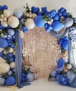 ✅ Arch of two hundred balloons of colour, including sixty blue chrome balloons, sixty golden chrome balloons, and sixty white latex balloons.