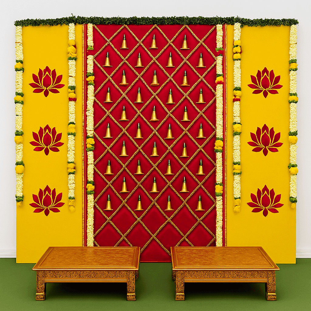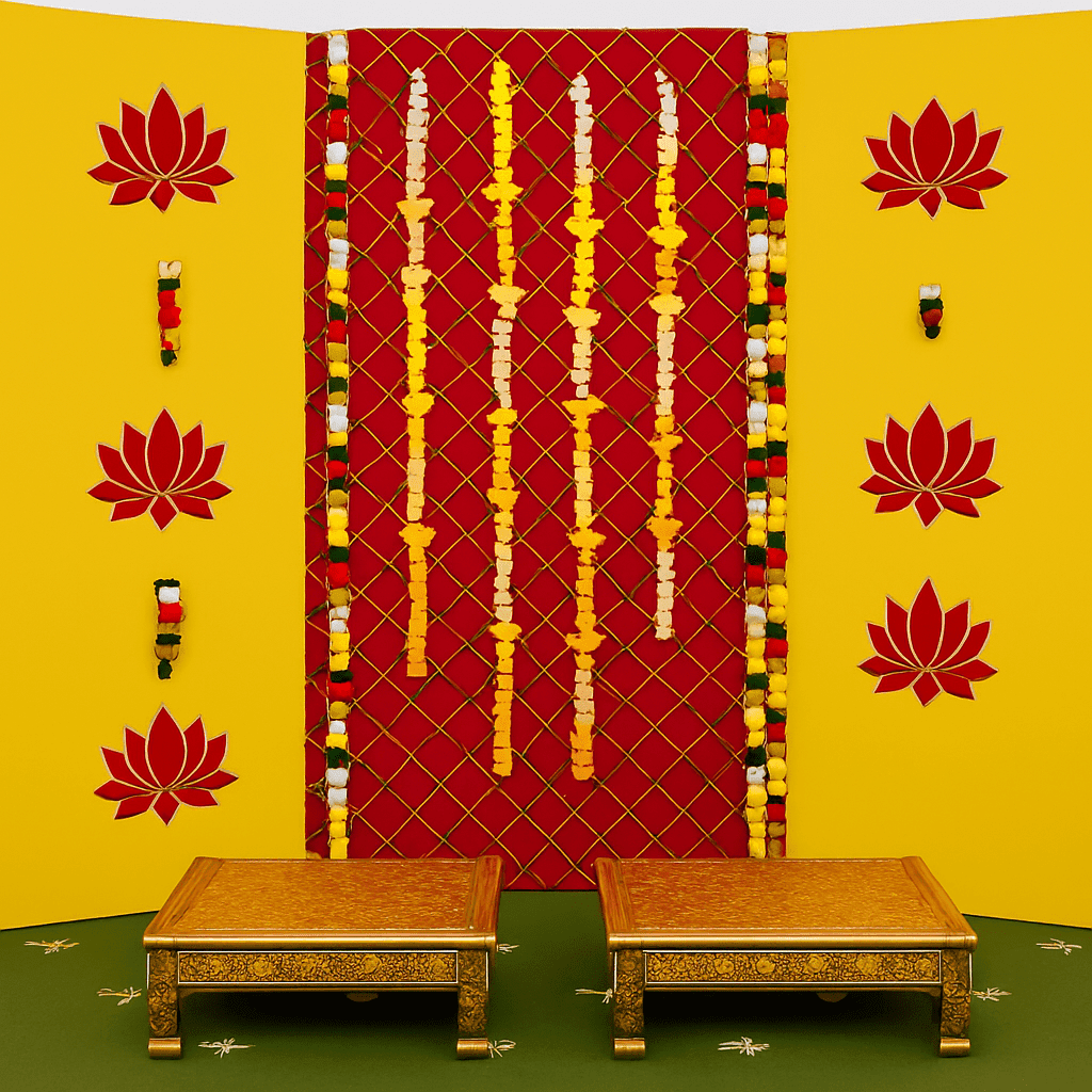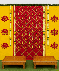 Letscelebrate brings you the perfect Haldi and Mehndi decoration idea with our Colorful Hangings Backdrop. This vibrant and traditional decor is designed to create a joyful and festive atmosphere for your wedding ceremonies. Searching for unique Haldi decor or colorful Mehndi backdrop ideas? Our setup, featuring elegant brass pots, pampas grass, and a stunning mix of garlands and lights, provides a grand, royal, and elegant feel. With our customizable decor, you can ensure your celebration has the perfect backdrop for vibrant photography and unforgettable memories. Choose Letscelebrate to bring your dream wedding decor to life.
