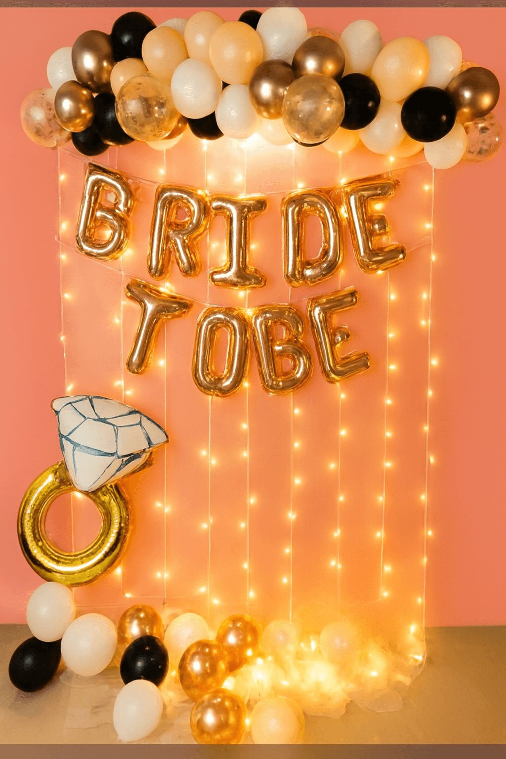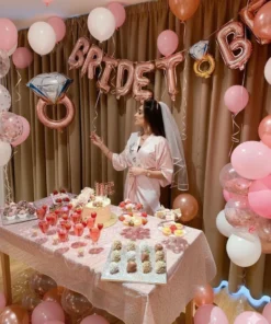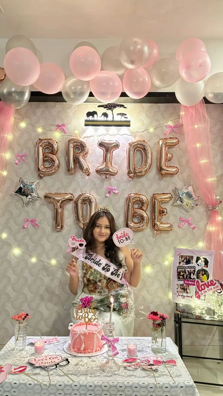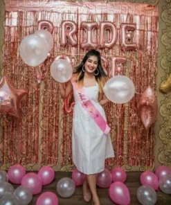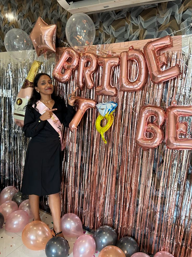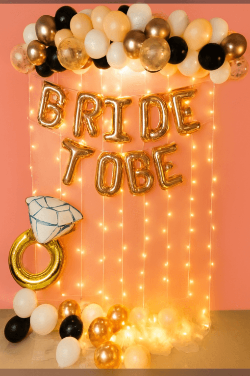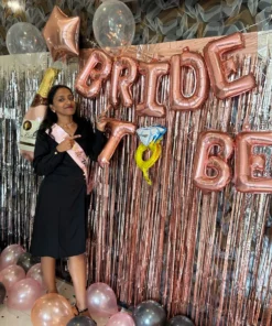 It is time to kiss the “Miss” goodbye by throwing a grand bachelorette party that the bride-to-be will cherish forever. With Letscelebrate, you can embrace gorgeous rose gold and peach pastel balloons that are designed to mesmerize your guests and create an atmosphere of pure joy. If you have been dreaming of the perfect celebration, Letscelebrate helps you execute those ideas flawlessly with a classy setup featuring a white net backdrop illuminated by soft LED lights. This stunning arrangement by Letscelebrate includes a professional arch of black, white, peach, and rose gold chrome balloons, accented with a “Bride To Be” foil sign and a giant ring-shaped balloon for that extra touch of glamour. Whether you are transforming a home, a hotel room, or a private venue in Delhi NCR, Letscelebrate ensures your space radiates the ultimate bachelorette vibes with premium ribbons and free-floating balloons.