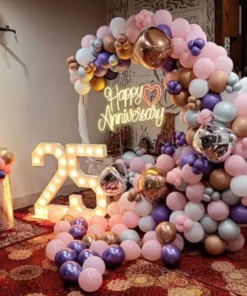 Ready to celebrate your anniversary in the most captivating way imaginable? Letscelebrate’s Lavender Rose Extravaganza Anniversary Decoration Backdrop is a true masterpiece designed to leave you and your loved ones in awe. This stunning setup transforms any space – be it your home, rooftop, or restaurant – into a romantic haven, perfect for marking your milestones of love and togetherness. Imagine a dreamy ambiance created with a radiant “Happy Anniversary” silver foil balloon, mesmerizing pixel lights, and a breathtaking blend of purple pastel, chrome pink, and chrome silver-purple latex balloons. To add a touch of whimsy and ethereal charm, we’ve adorned the backdrop with delicate rose gold butterflies and white floating balloons, ensuring every moment of your celebration is truly unforgettable.