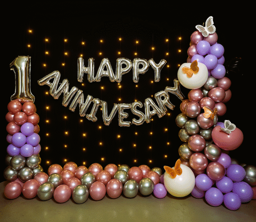 Ready to celebrate your anniversary in the most captivating way imaginable? Letscelebrate’s Lavender Rose Extravaganza Anniversary Decoration Backdrop is a true masterpiece designed to leave you and your loved ones in awe. This stunning setup transforms any space – be it your home, rooftop, or restaurant – into a romantic haven, perfect for marking your milestones of love and togetherness. Imagine a dreamy ambiance created with a radiant “Happy Anniversary” silver foil balloon, mesmerizing pixel lights, and a breathtaking blend of purple pastel, chrome pink, and chrome silver-purple latex balloons. To add a touch of whimsy and ethereal charm, we’ve adorned the backdrop with delicate rose gold butterflies and white floating balloons, ensuring every moment of your celebration is truly unforgettable.