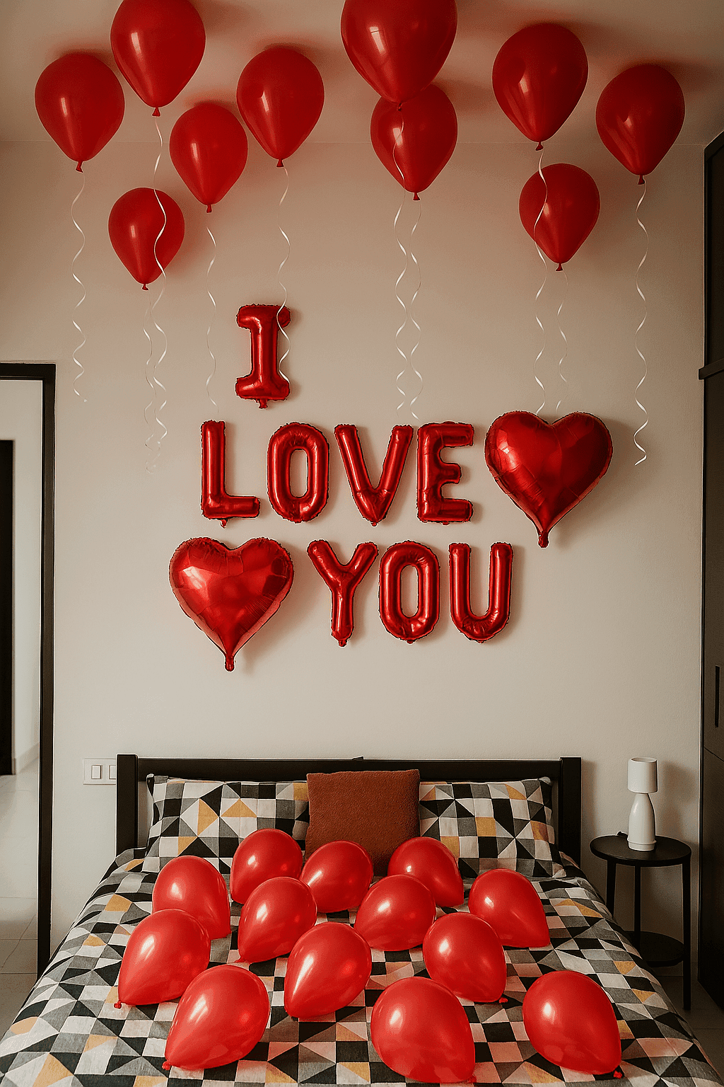 Looking to infuse your bedroom with passion and celebrate your love in the most exquisite way? Let’s Celebrate curates a charming “Love Blooms” decor designed to transform your space into a uniquely romantic haven, ensuring a night you both will cherish for years to come. Our special decor is not just stunning and romantic; it comes straight from the heart. We create a dreamy atmosphere with red heart-shaped foil balloons adorning both walls and ceiling. Complementing this, “I Love You” foil balloons take center stage, while classic red balloons fill the room, creating a grand, truly celebratory, and romantic vibe. This signature decor is guaranteed to sweep your partner off their feet as you make the most exciting and lasting memories together!