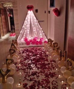 Step into a world of pure romance with Letscelebrate’s magical Love Canopy installation, meticulously crafted to set the perfect atmosphere for your most special evenings. Imagine a dreamy scene featuring a dense wooden canopy adorned with a captivating fairy light canopy, lush red and white roses, softly positioned candles, and the illuminated word “LOVE.” This exquisite setup is ideal for proposals, anniversary nights, or intimate candlelit dinners. Every detail, from the comfortable furnishing with pillows and flowers to the enchanting lighting, encourages you to savor each second. This is the ultimate atmosphere for crafting memories that will truly last forever, whether you’re enjoying a peaceful supper or embarking on a lifelong commitment.