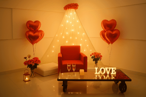 Step into a world of pure romance with Letscelebrate’s magical Love Canopy installation, meticulously crafted to set the perfect atmosphere for your most special evenings. Imagine a dreamy scene featuring a dense wooden canopy adorned with a captivating fairy light canopy, lush red and white roses, softly positioned candles, and the illuminated word “LOVE.” This exquisite setup is ideal for proposals, anniversary nights, or intimate candlelit dinners. Every detail, from the comfortable furnishing with pillows and flowers to the enchanting lighting, encourages you to savor each second. This is the ultimate atmosphere for crafting memories that will truly last forever, whether you’re enjoying a peaceful supper or embarking on a lifelong commitment.
