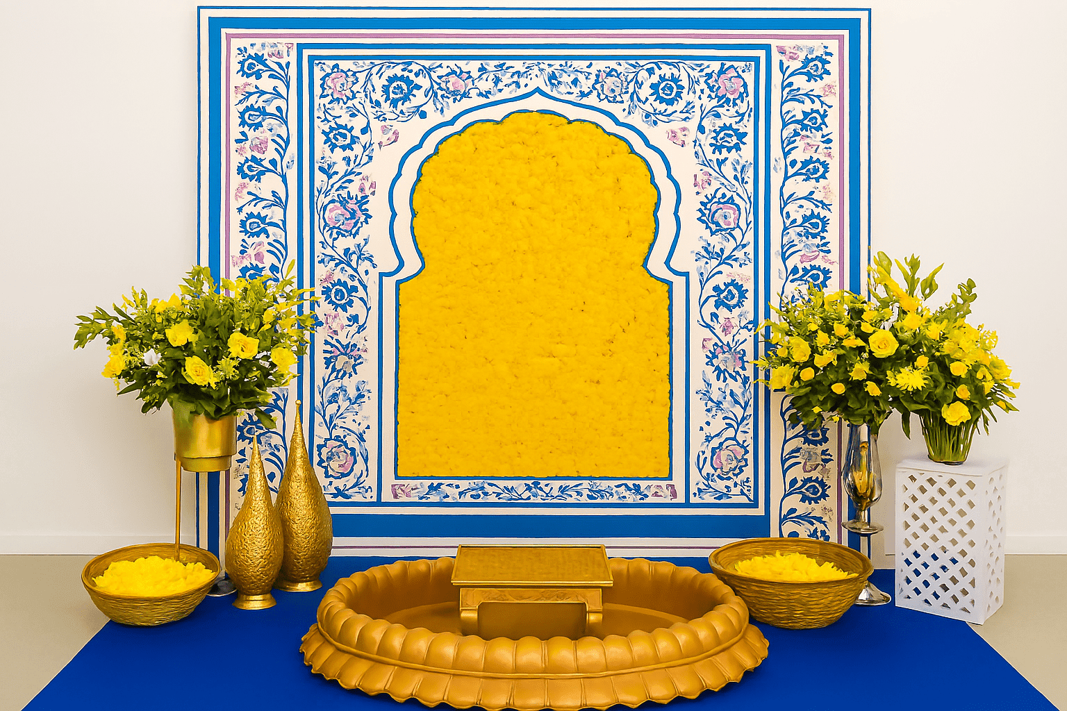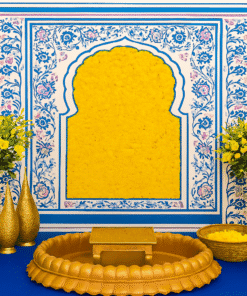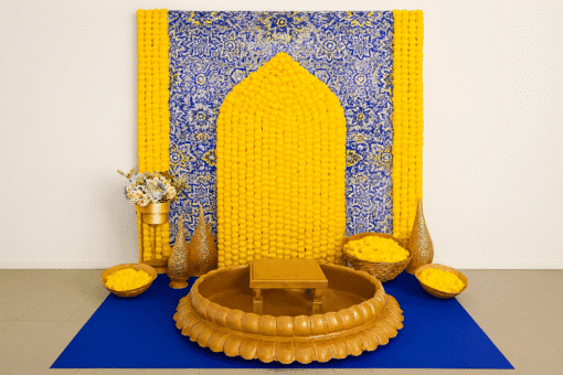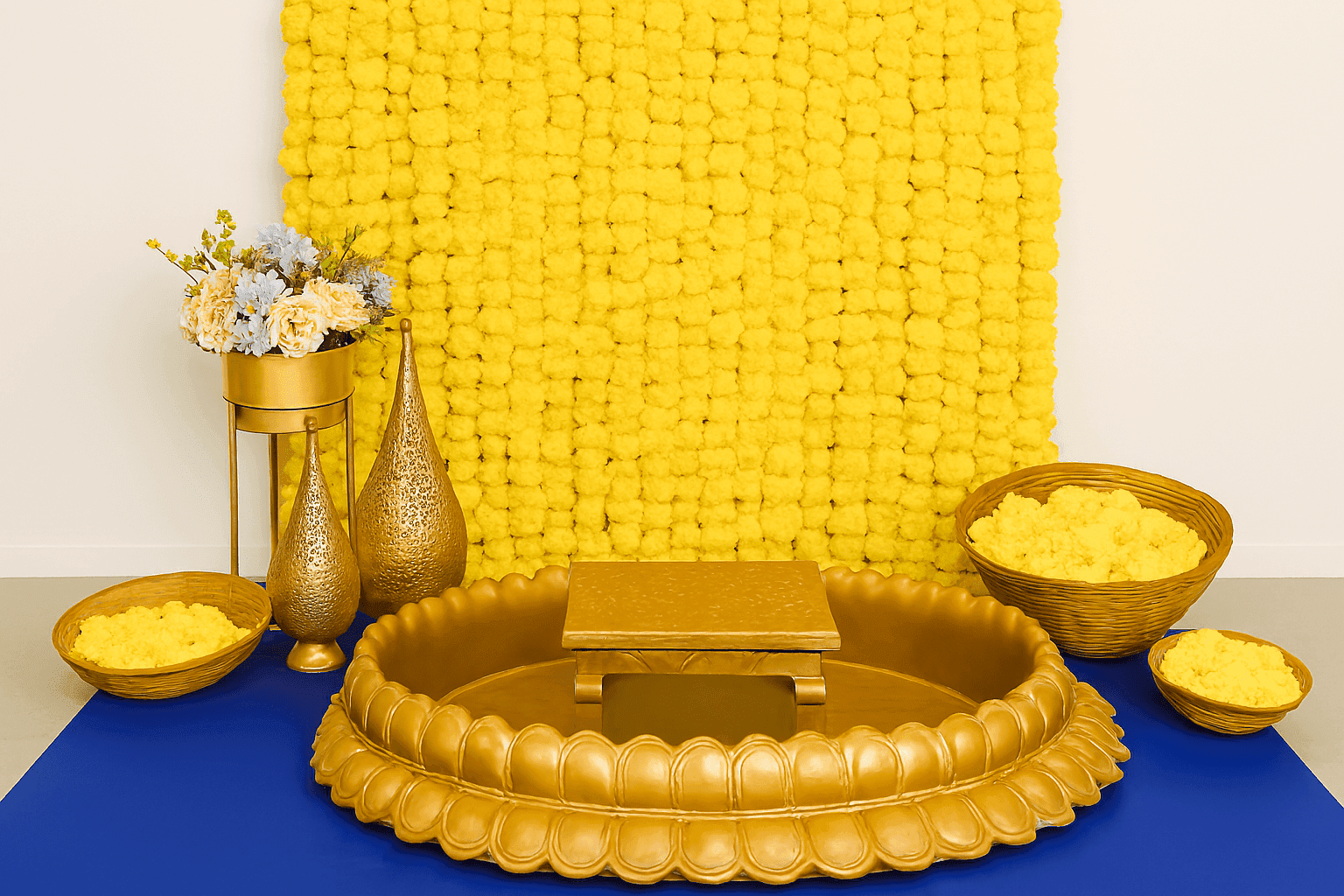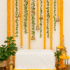 ✅ One Blue Textured Flex (seven ft x seven ft) decorated with forty-five Artificial Yellow Garlands.