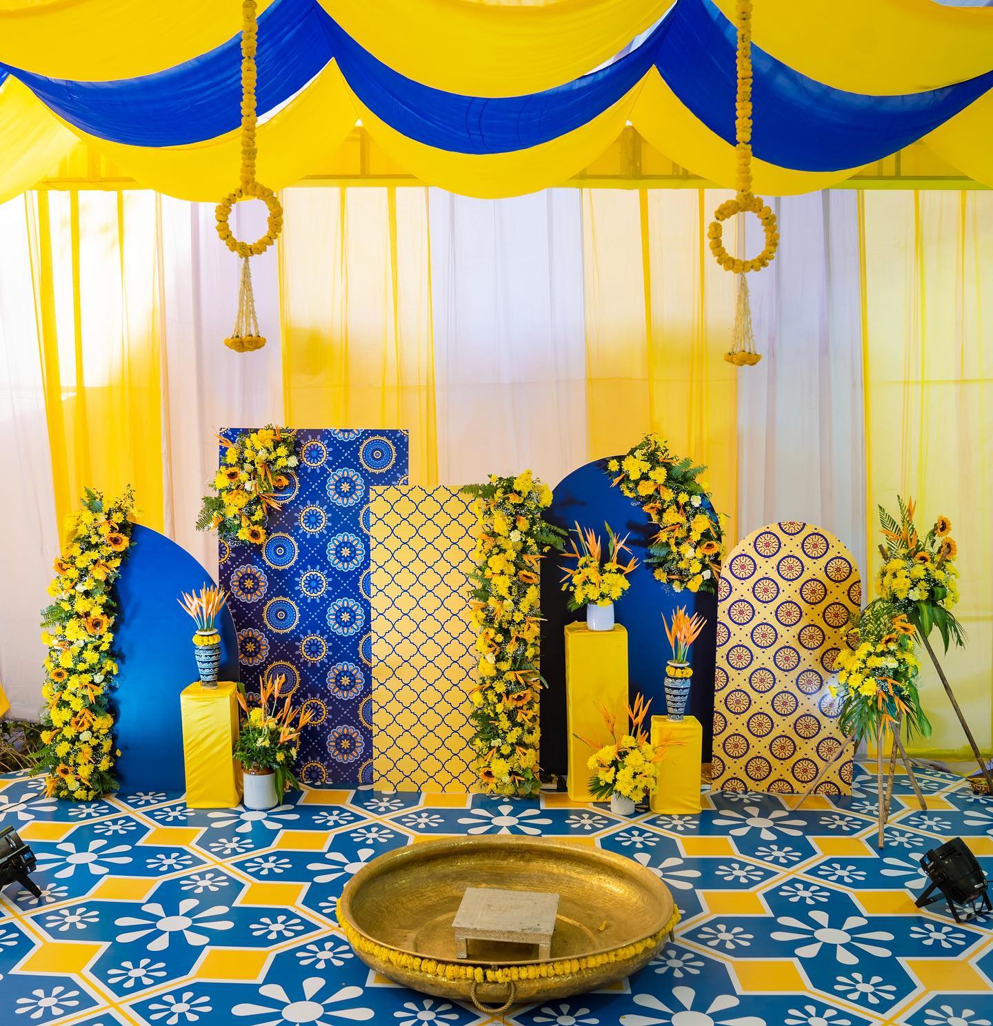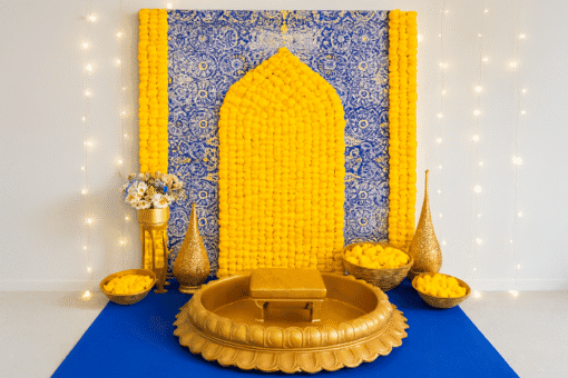 Make your Haldi ceremony an unforgettable experience with Letscelebrate’s exclusive Mediterranean Theme Haldi Decor. This unique theme blends the rich culture and stunning landscapes of the Mediterranean with the joy and vibrancy of your celebration, creating a truly memorable and meaningful event. Our fascinating setup features a blue textured flex backdrop adorned with artificial yellow garlands, providing a striking background for photos. To complete the Mediterranean look, we include elegant brass lamps, cane baskets filled with garlands, and a golden flower pot overflowing with artificial flowers. This decor reflects the bright and bold colors of the region, ensuring your Haldi ceremony feels both traditional and excitingly new.