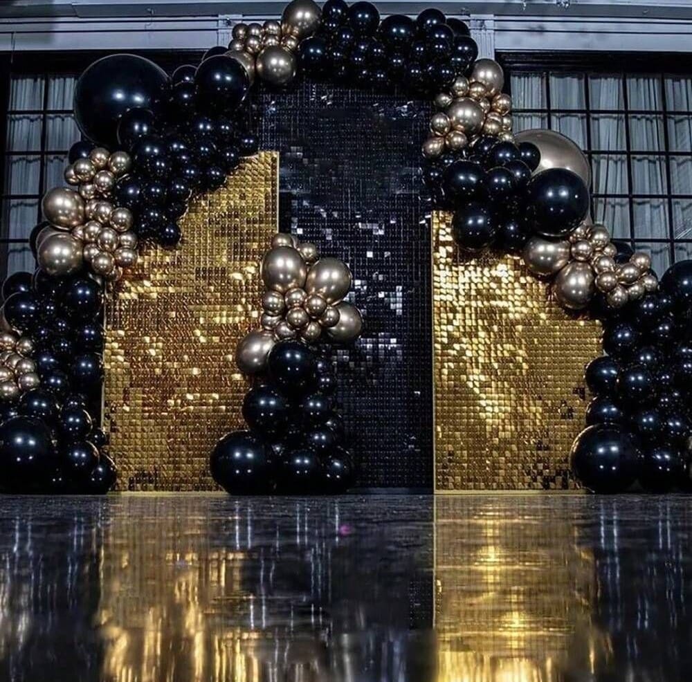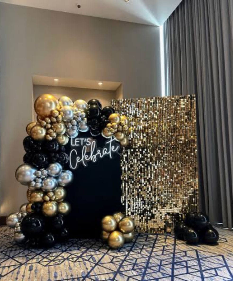 No occasion is too little to celebrate, especially the grand arrival of the New Year! As you prepare to usher in 2026, the vibe of your party is what truly matters. Long gone are the days of simple decorations; Letscelebrate introduces the Stylish Black Sequin Lets Party Decor, perfectly setting the tone for a glamorous New Year’s Eve. This decor package is perfect for celebrating new beginnings, combining classic themes of style and sophistication with essential fun party elements like lights and balloons. These decorations are of the highest quality and will surely transform your venue into a chic celebration space. With this decor, you will receive one Black Sequin backdrop, a vibrant ‘Let’s Party’ Neon Light, and a beautiful arch of 80 balloons—50 Black latex and 30 Silver chrome—elegantly decorated with artificial golden leaves and three flower bunches. The style is continued with a bunch of 24 balloons (20 Black latex and 4 Silver chrome) adorned with artificial golden leaves, two Silver 4D balloons, and a sophisticated Flower Arrangement at the corner featuring six artificial flower bunches and one Golden leaf, ensuring a magnificent welcome to 2026.