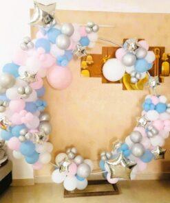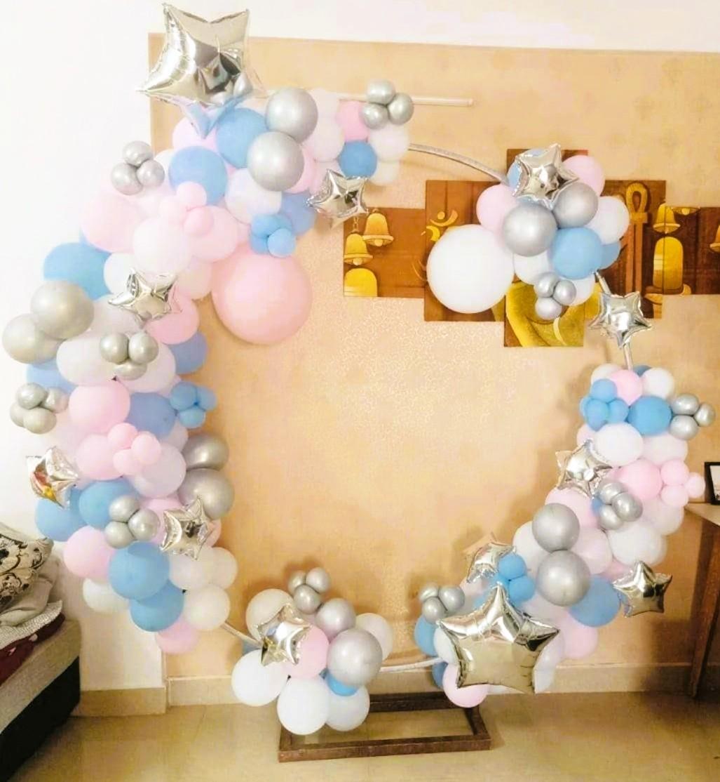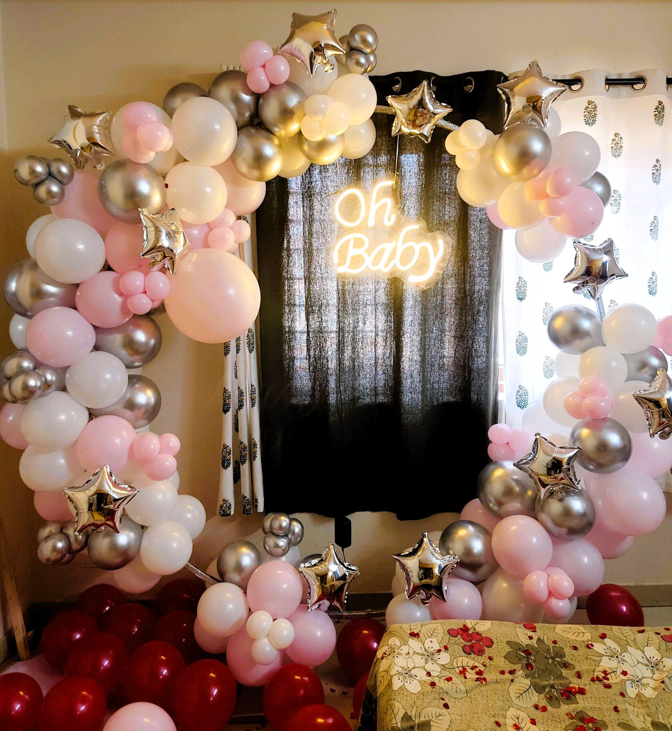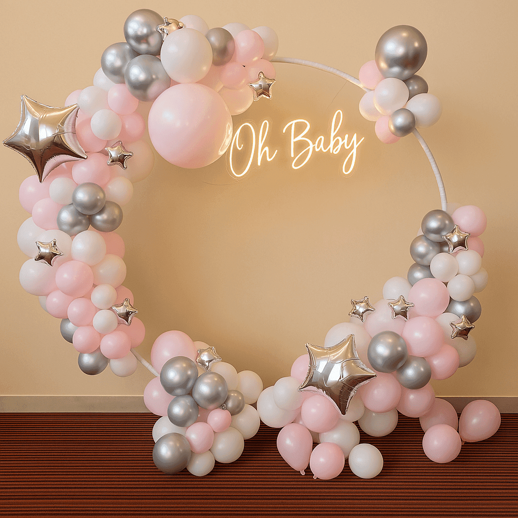 Make the mom-to-be feel truly special with a breathtaking surprise! Our Pastel and Silver Baby Shower Decor is a beautifully curated package that transforms any space into a stunning celebration. With its elegant mix of pastel pink and shimmering silver, this decor is designed to create a warm, soothing, and memorable atmosphere. This exquisite setup features a 7x7ft Circular Ring Stand adorned with a charming arch of pastel pink, white latex, and silver chrome balloons. A glowing “Oh Baby” neon light adds a modern touch, while delicate silver star balloons provide a celestial accent. This versatile decor is not only perfect for a baby shower but can also be used for a Welcome Baby party, your baby’s first birthday, and more, ensuring your special moments are always celebrated in style.