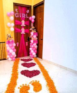 Get ready to celebrate your baby girl’s grand entrance with Letscelebrate’s exciting “Pink Carpet” Welcome Decor! Imagine charming petal footsteps and adorable hearts leading the way, with poppy pink net adorning your doors for a truly grand welcome. Two cute teddy bears at the entrance add a mega-dose of cuteness, perfectly complementing quirky paper cutouts scattered throughout. The real showstopper: a magnificent entrance framed by two balloon pillars boasting 65 metallic pink and latex white balloons, with a vibrant pathway of red and orange marigold petals. Letscelebrate transforms your space into a fabulous floral extravaganza, ensuring an unforgettable celebration for your little princess!