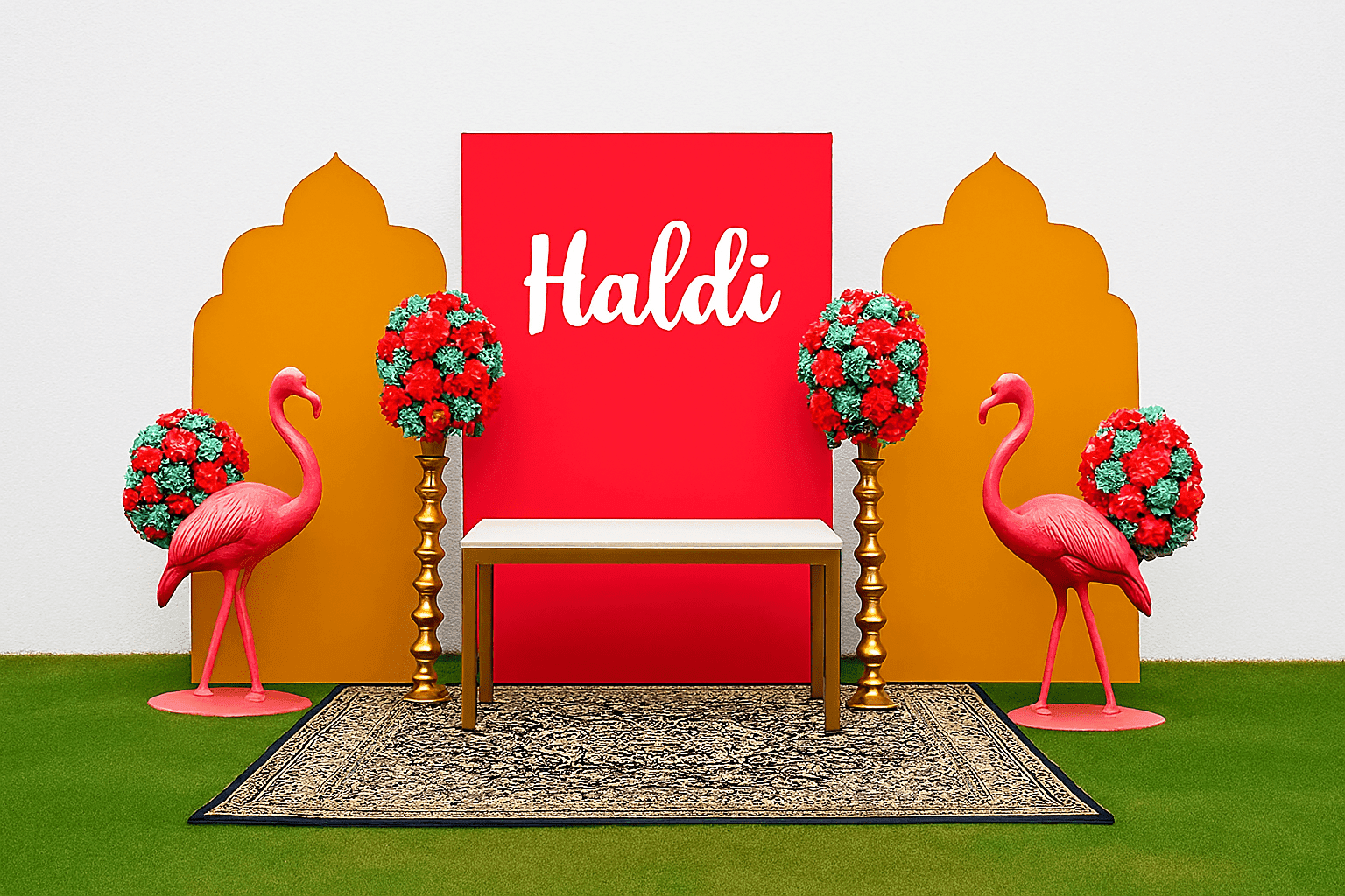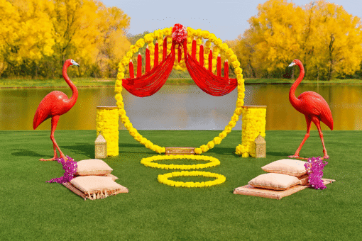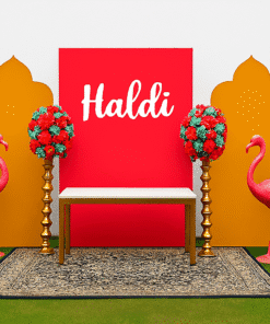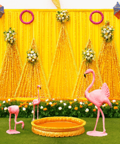 Letscelebrate offers a unique Haldi and Mehndi decor solution with our Pink and Yellow Flamingo Theme. Searching for tropical party ideas or a unique Haldi ceremony theme? Our decor, featuring a flamingo-adorned jhula, elegant lotus pots, and a mix of traditional and modern elements, is perfect for creating a vibrant and cheerful atmosphere. This theme is an excellent choice for anyone looking to add a pop of color and style to their celebration. Choose Letscelebrate to make your event a fun and festive occasion that will leave a lasting impression on all your guests.