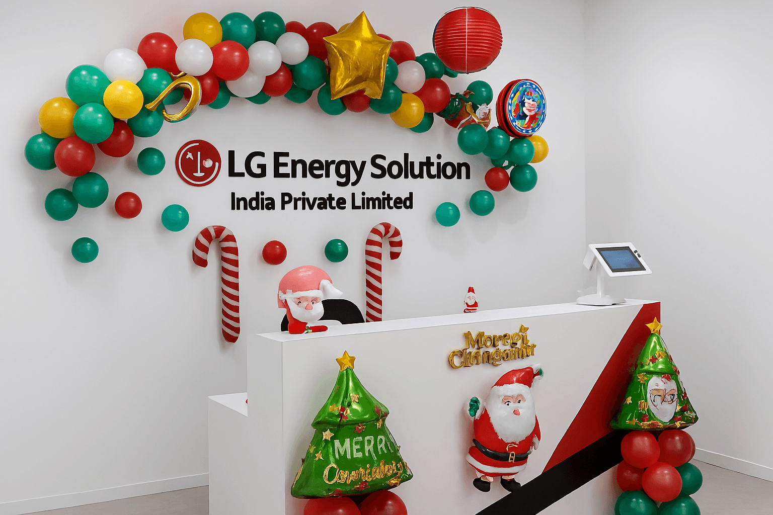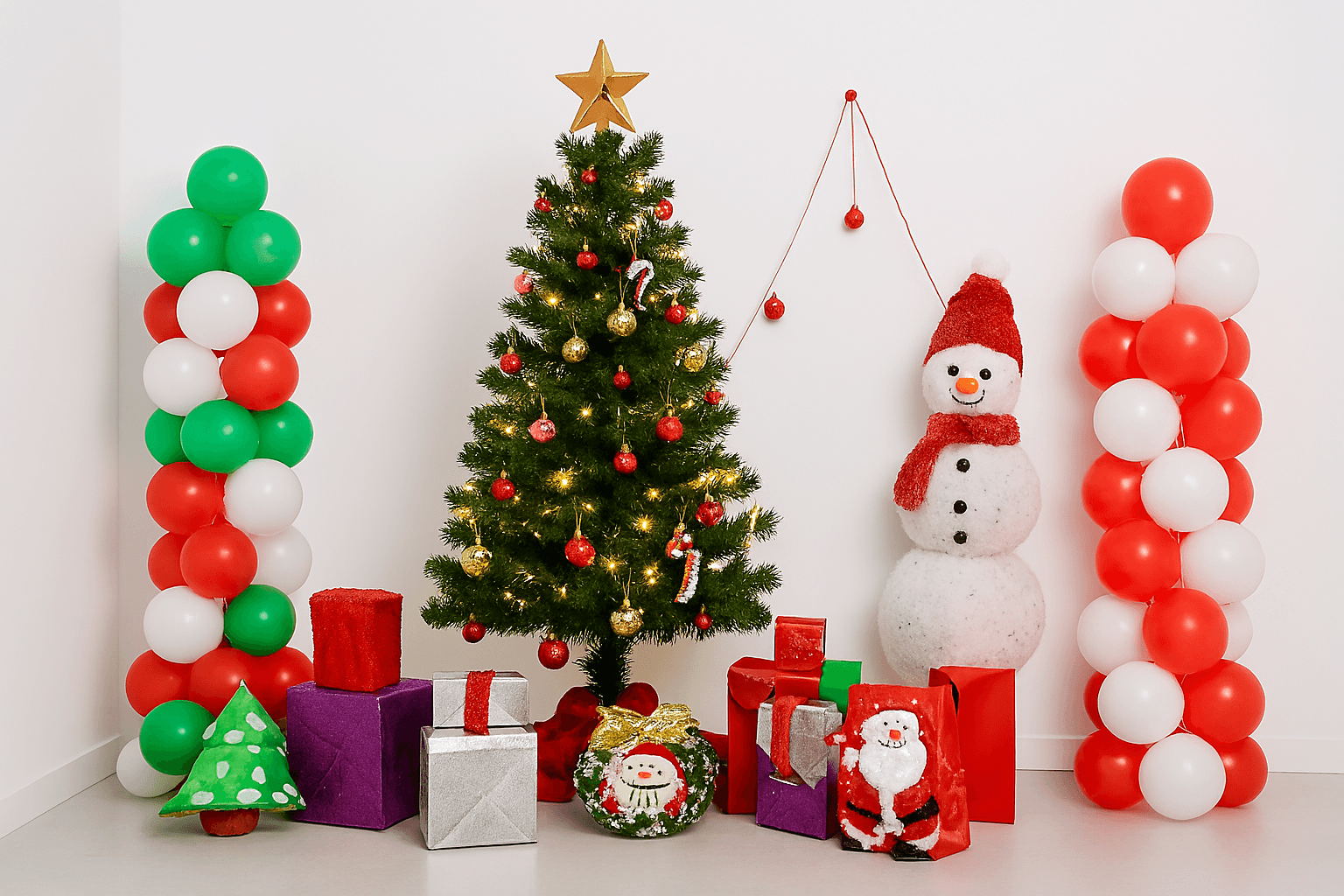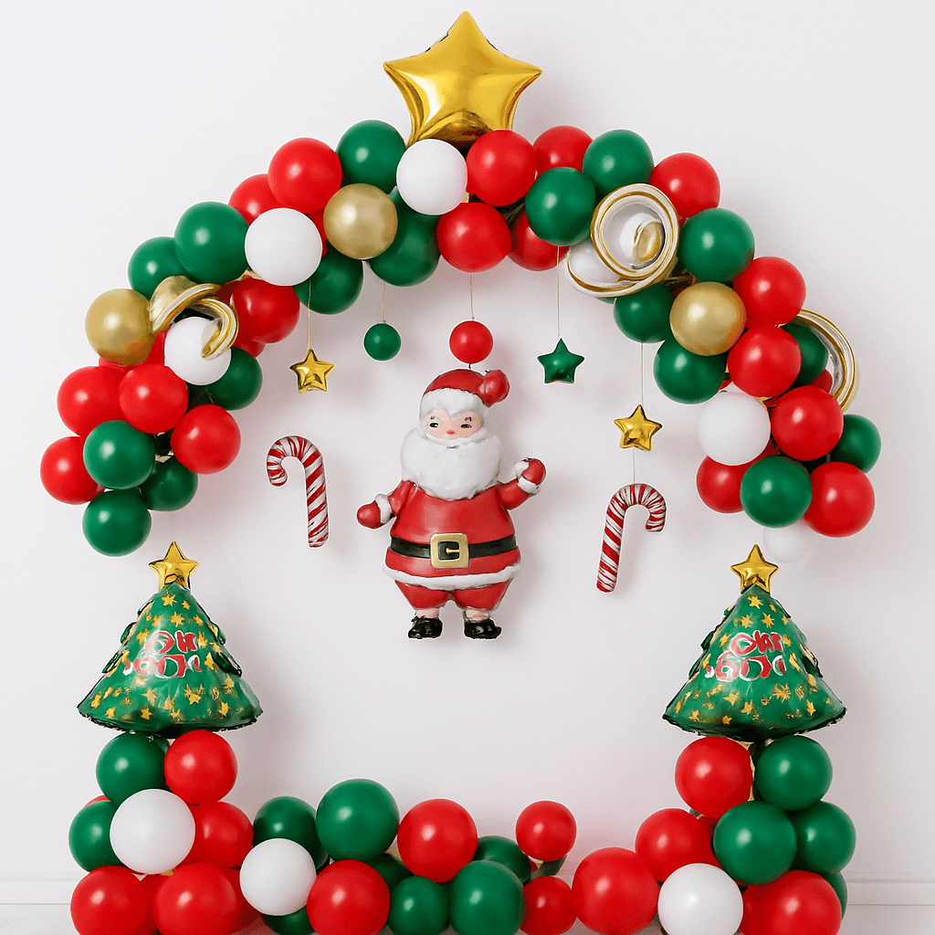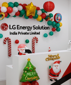 Planning a spectacular Christmas decoration for your home or office? You’ve come to the right place! Get the exclusive Letscelebrate Christmas Winter Theme Decor to arrange a perfect Christmas party with your close ones. This exquisite setup, filled with gorgeous and attractive balloons, is designed to instantly change the aura and mood of your guests, giving you the ultimate Christmas vibes. The stunning centerpiece of this decor is a designer arch crafted from Dark Green Latex (using a Green + Black double-balloon technique), White Latex, Red Latex, and Golden Metallic Balloons, accented with 4 BT Balloons and festive foil balloons, including a Golden Star, Santa, and Christmas Tree shape. Complementing the arch are two Balloon Pillars made with red and green latex, a Candy Cane Shaped Foil Balloon, and free-floating balloons scattered across the floor. This charming and vibrant Merry Christmas Decoration is the best fit for your party and is easily available to enhance the look of your home, room, or office anywhere in Delhi NCR.