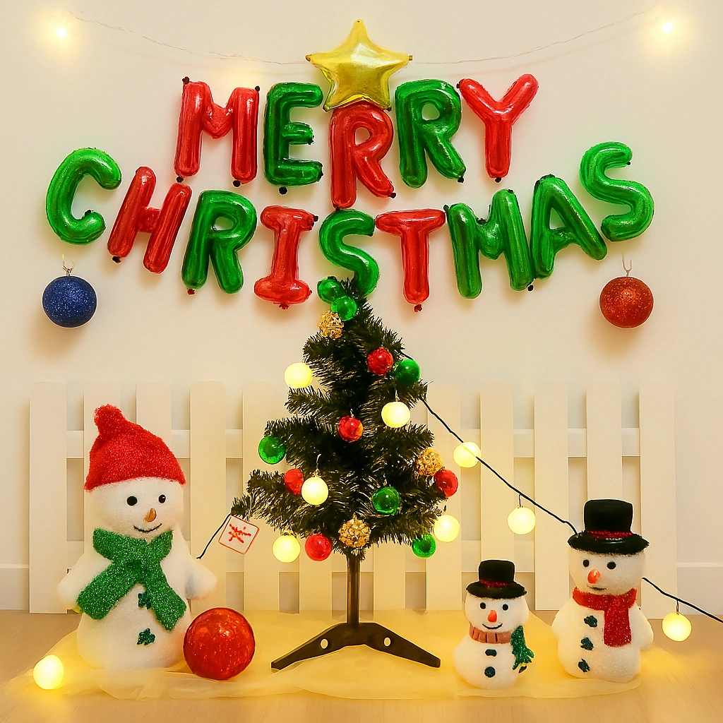 Celebrate Christmas like never before! Add to your celebrations not only a Christmas Tree but also a wonderful, comprehensive decoration package from Letscelebrate! Filled with elegance and charm, this decor will brighten up every place wherever you choose to have it, making Christmas the beautiful festival it is meant to be for your friends and family. Adding this charming decoration will instantly light up your moods and give a festive feel, making it perfect if you are planning a Christmas party at your office, home, or school, easily transforming into office decoration, school decoration, and more. This Elegant Christmas Room Decoration is uniquely curated with a Brick Effect Flex backdrop (6x6ft), Green and White Frill Moss, Merry Christmas Foil Balloons, Fairy Lights, a Santa Claus Sun board Cutout (3x2ft), and a decorated 3ft Non-Pine Christmas Tree, all placed on a 4 Mtr White Net to give a beautiful snow effect. This Merry Christmas Decoration Idea is trendy and perfect for enhancing the aura and look of your place anywhere in Delhi NCR, ensuring the colors and charm of the Letscelebrate decor give you the ultimate Christmas Vibes.